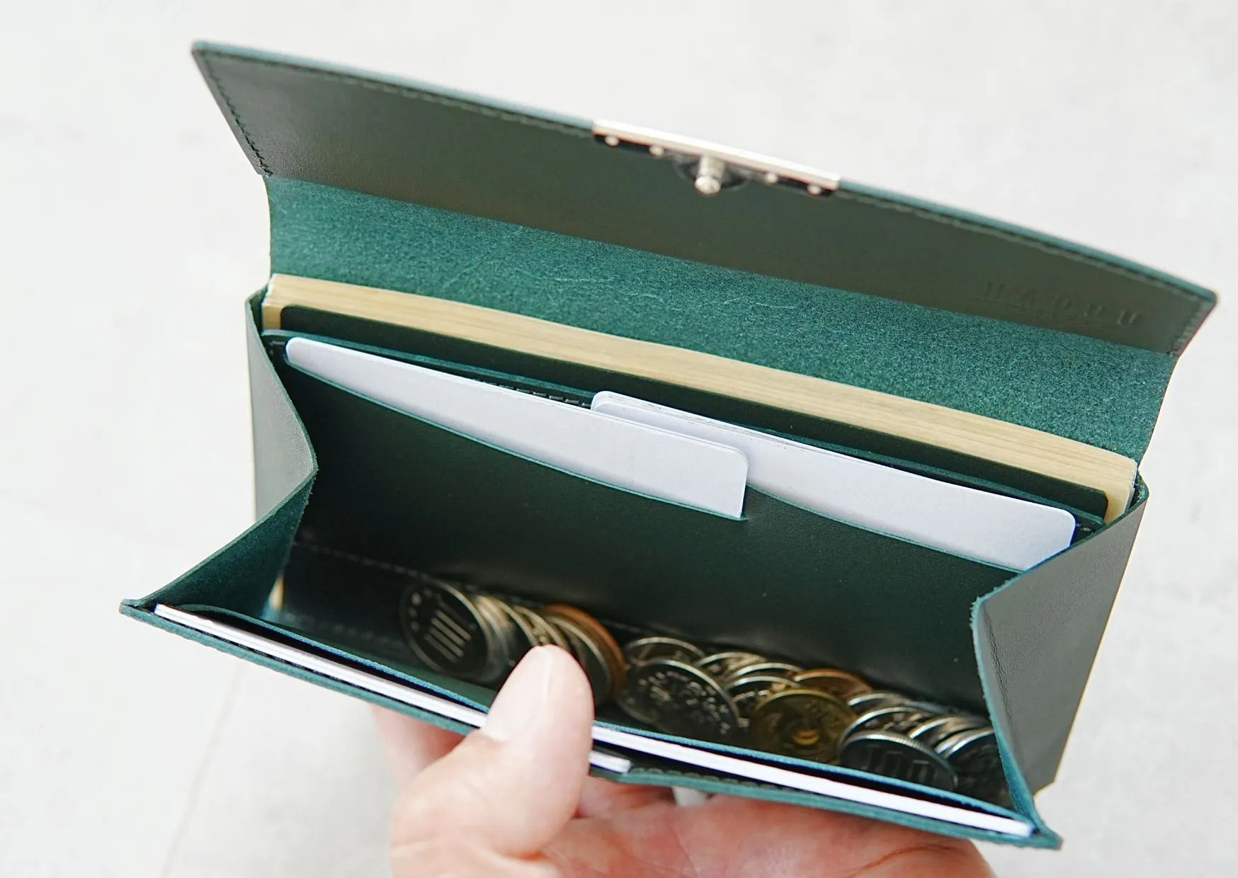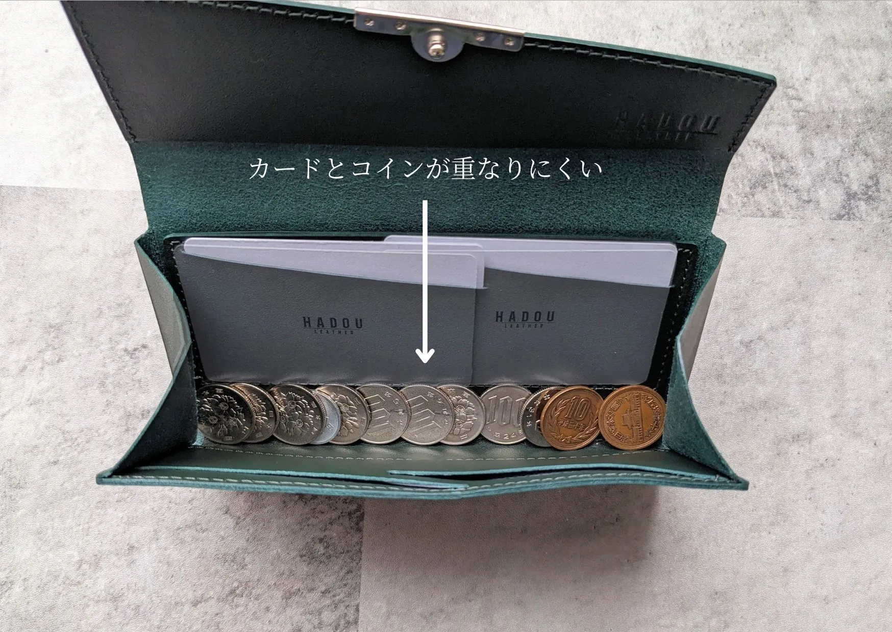 加えてコイン収納部とカード収納部の空間を共有することでコインケース用の余分な革を省くことができました。この構造を採用することで「薄くても大容量」を確保し「高さ8.3cm」の極小サイズにすることができました。