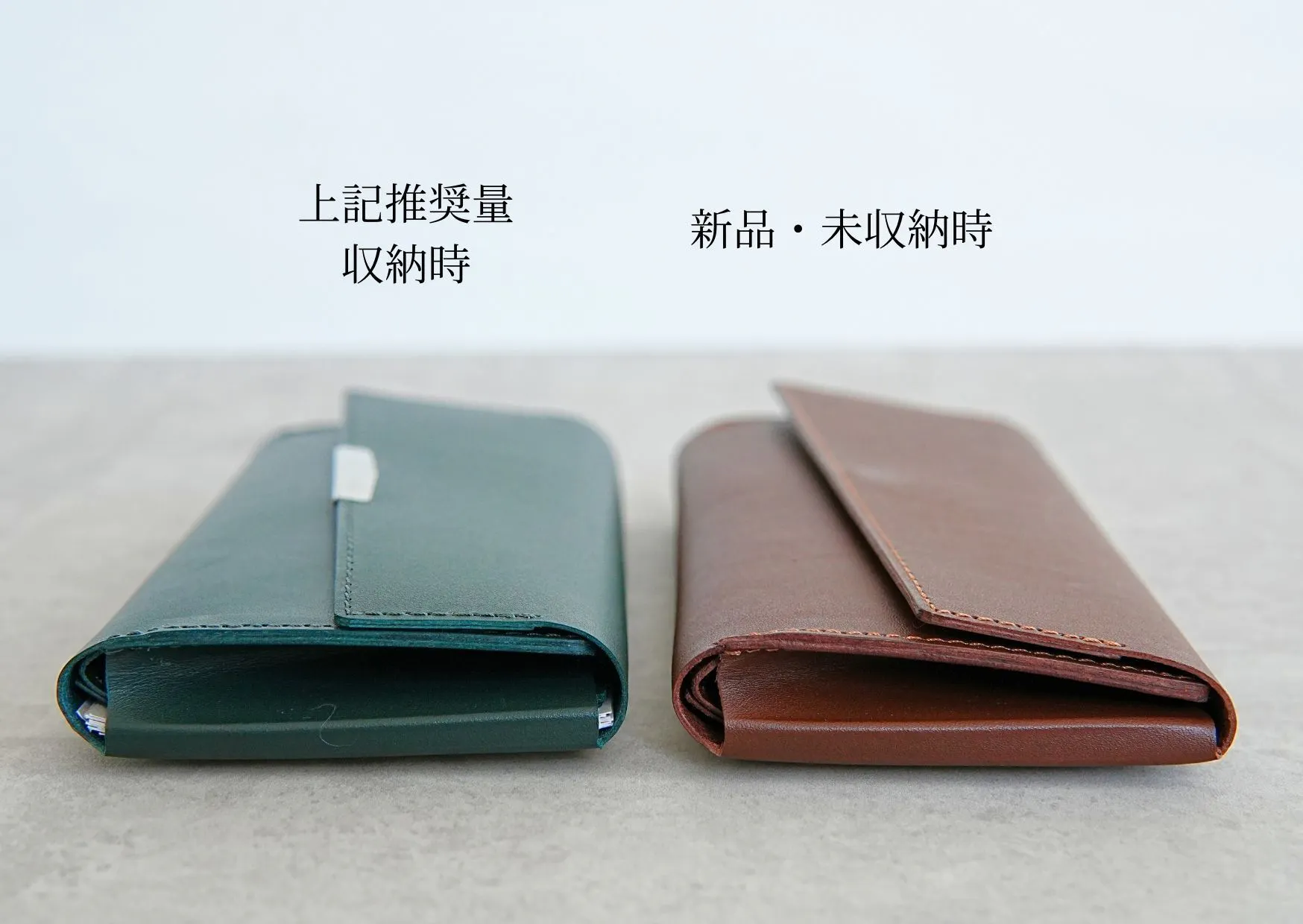 ・新品時は革の硬さのため少しふっくらとしていますが使用する過程で少しずつなじんでいきます。