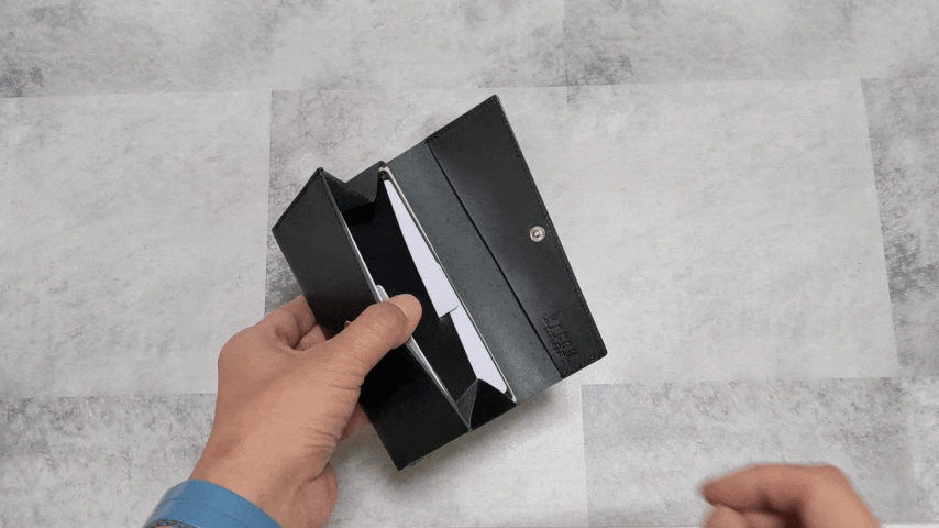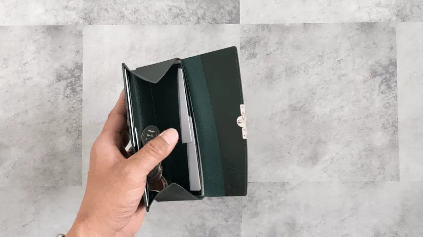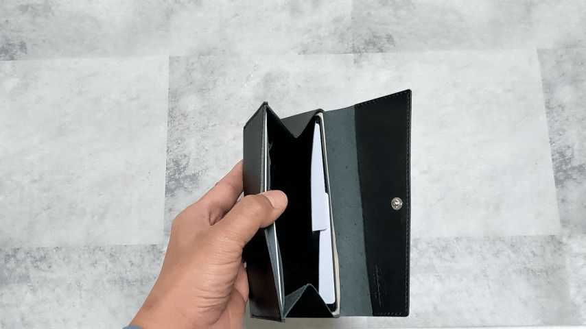 前述したように一万円札が入る限界サイズを突き詰めて横幅は16.3cm。紙幣の出し入れはこのようにとってもスムーズです。