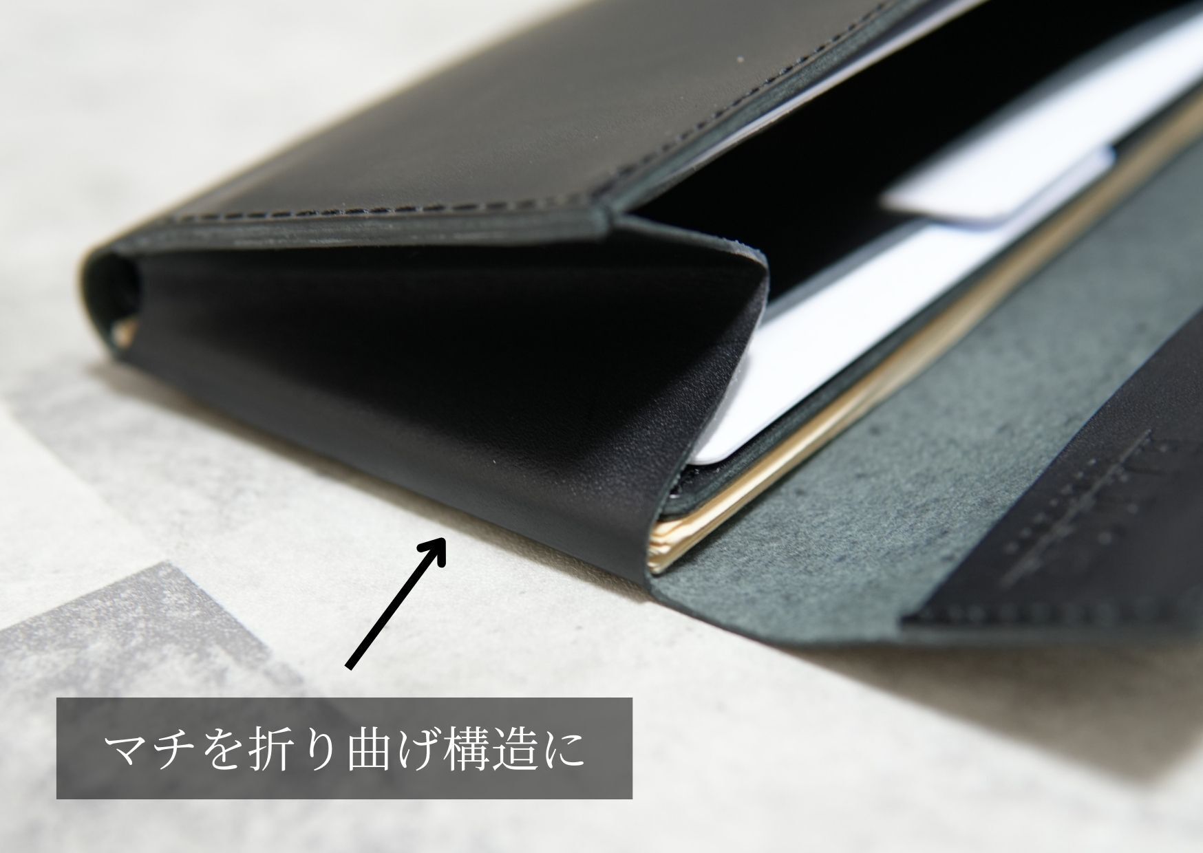 加えてコイン収納部とカード収納部の空間を共有することでコインケース用の余分な革を省くことができました。この構造を採用することで「薄くても大容量」を確保し「高さ8.3cm」の極小サイズにすることができました。