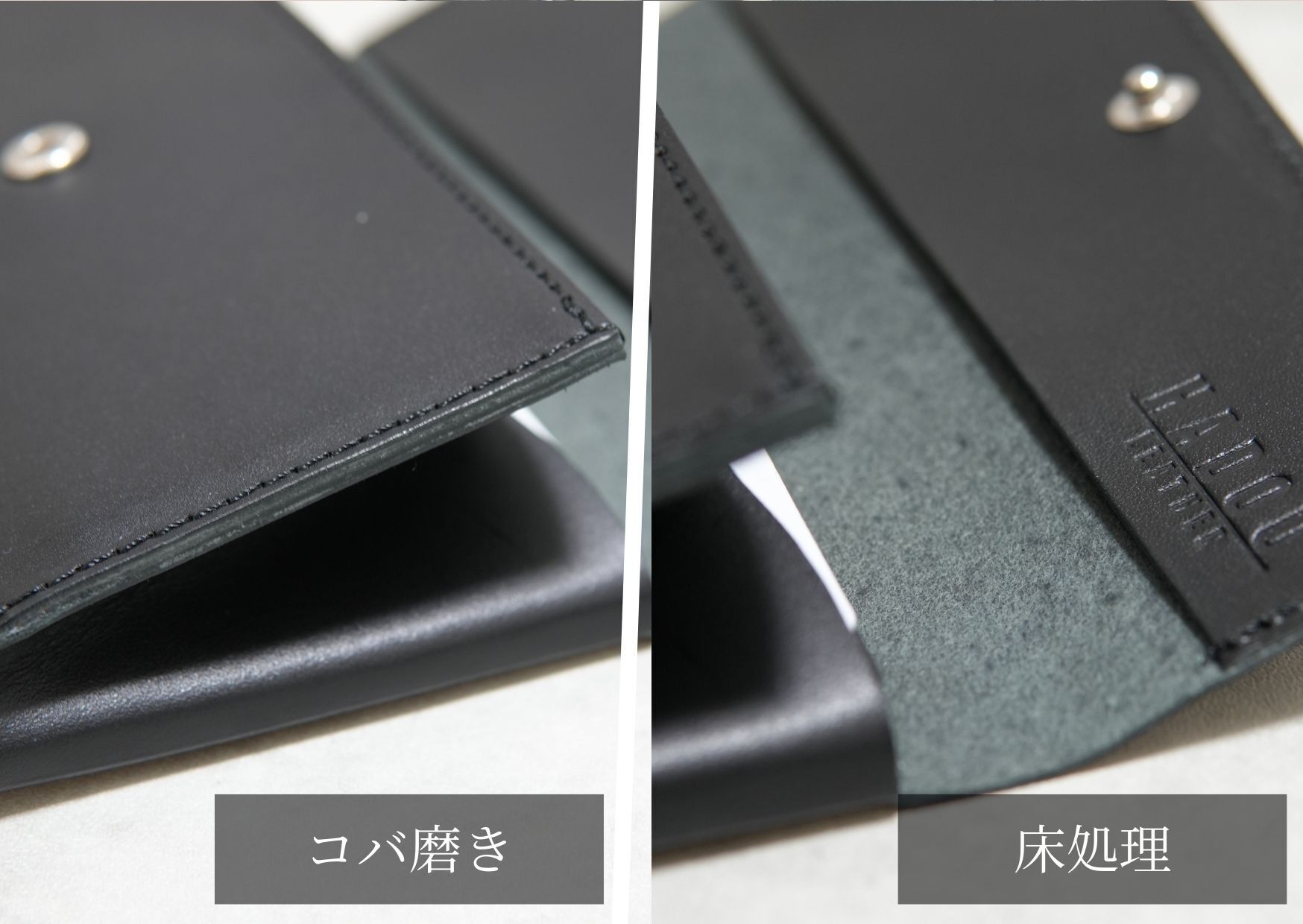 革の床(裏面)やコバ(革の断面)は素材そのままでは毛羽立って見た目が悪いことや、革自体の耐久性も悪くなります。床やコバを整える工程は手間と時間を要するところですが、細かいところまで品質向上に努めております。