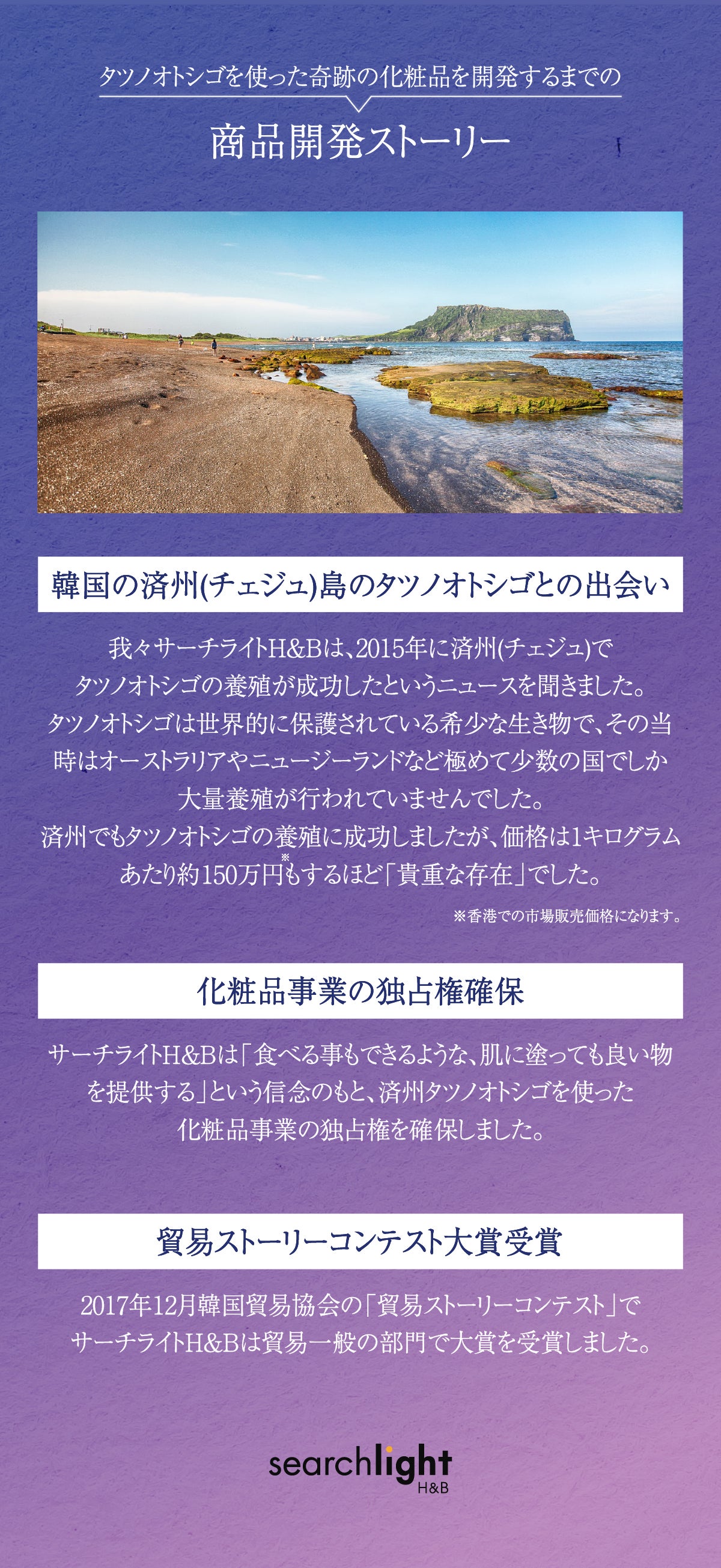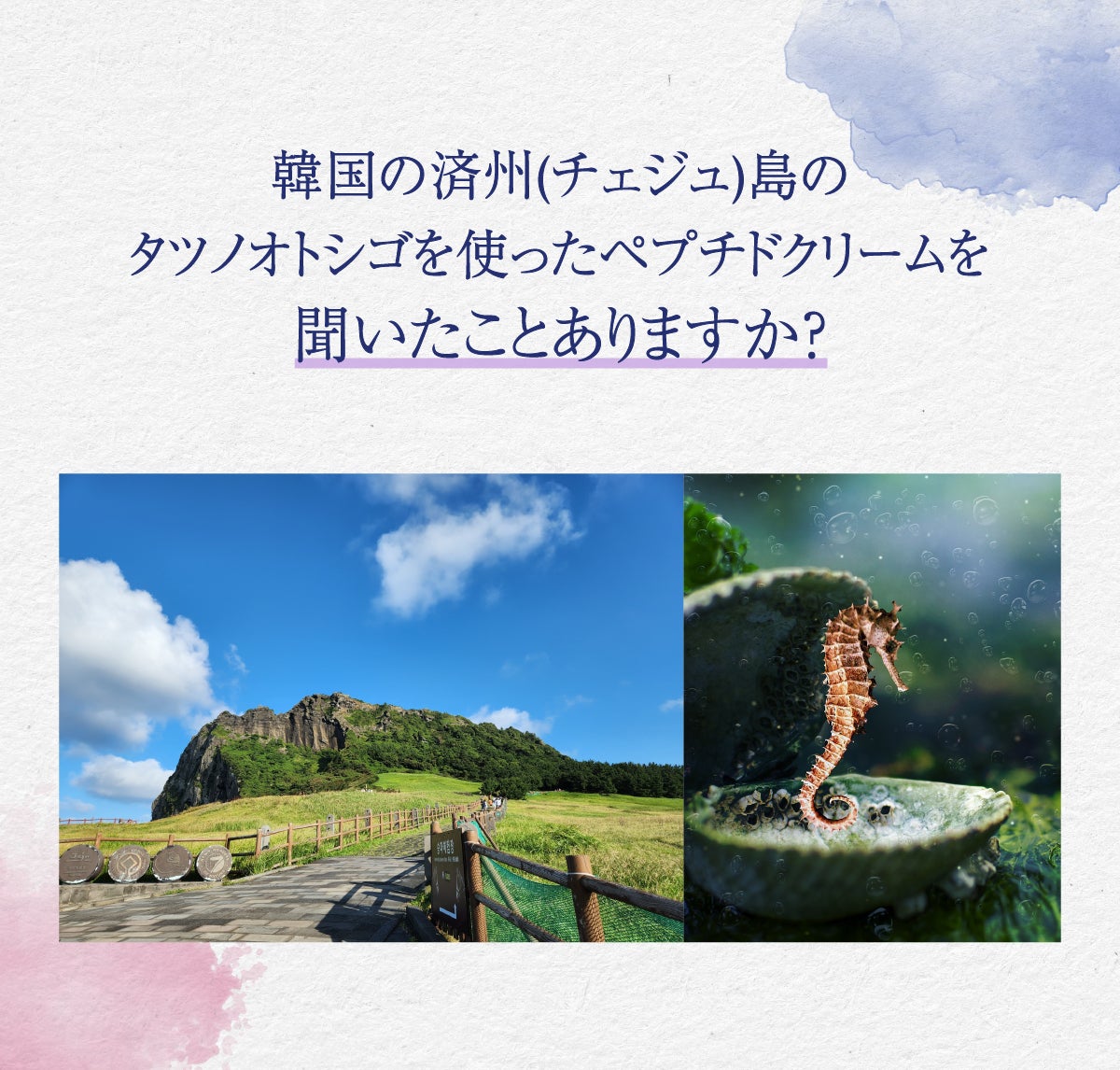 韓国では2015年から食品原料として認証されこのタツノオトシゴペプチドクリームを作ることになりました。済州タツノオトシゴの効能実験、低刺激実験、肌パッチ評価を完了し、クリーム、マスクパック、セラムなど様々なスキンケア製品にも活用しています。