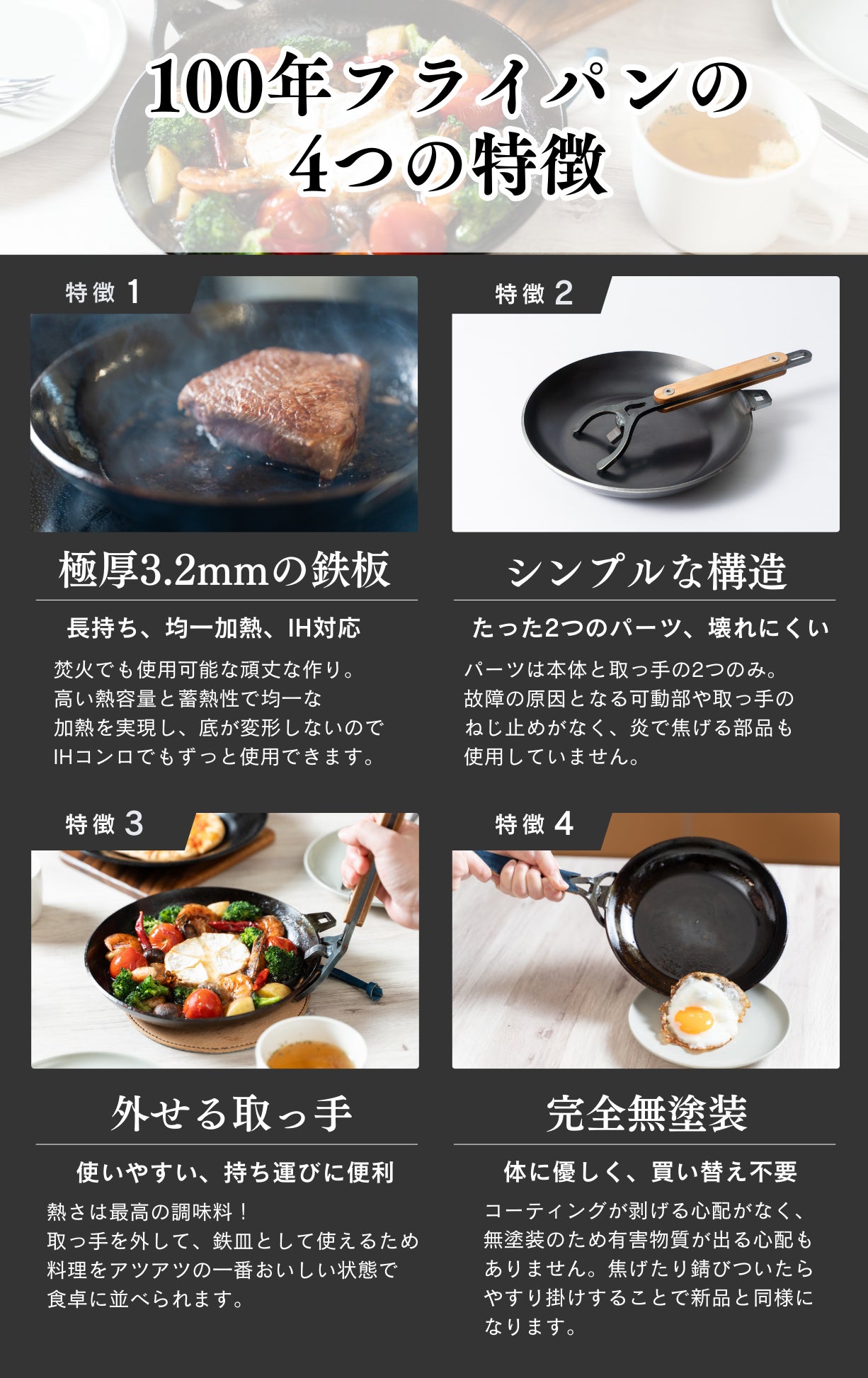このフライパンは通常のフライパンの2倍厚い鉄板のため、焚火などの高温な熱源でもほとんど変形しません。お家だけでなく、休日のキャンプでも最高の料理をふるまうことができます。100年間、あなたの相棒となるフライパンを目指しています。