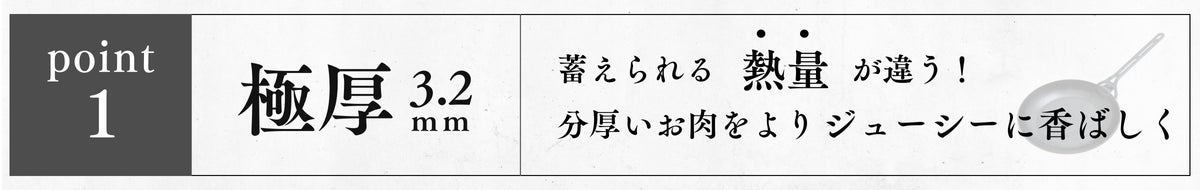 1.6~6.0 mm厚の鉄板を比較し、鉄フライパンの魅力を味わえる最適な厚さ3.2mmにたどり着きました。鉄板は厚すぎると温まりにくくフライパンには不向き…一方薄すぎる鉄板だと蓄熱性が低く、料理がおいしくならない…何度も試作を繰り返し、たどり着いた厚さが3.2 mmです。