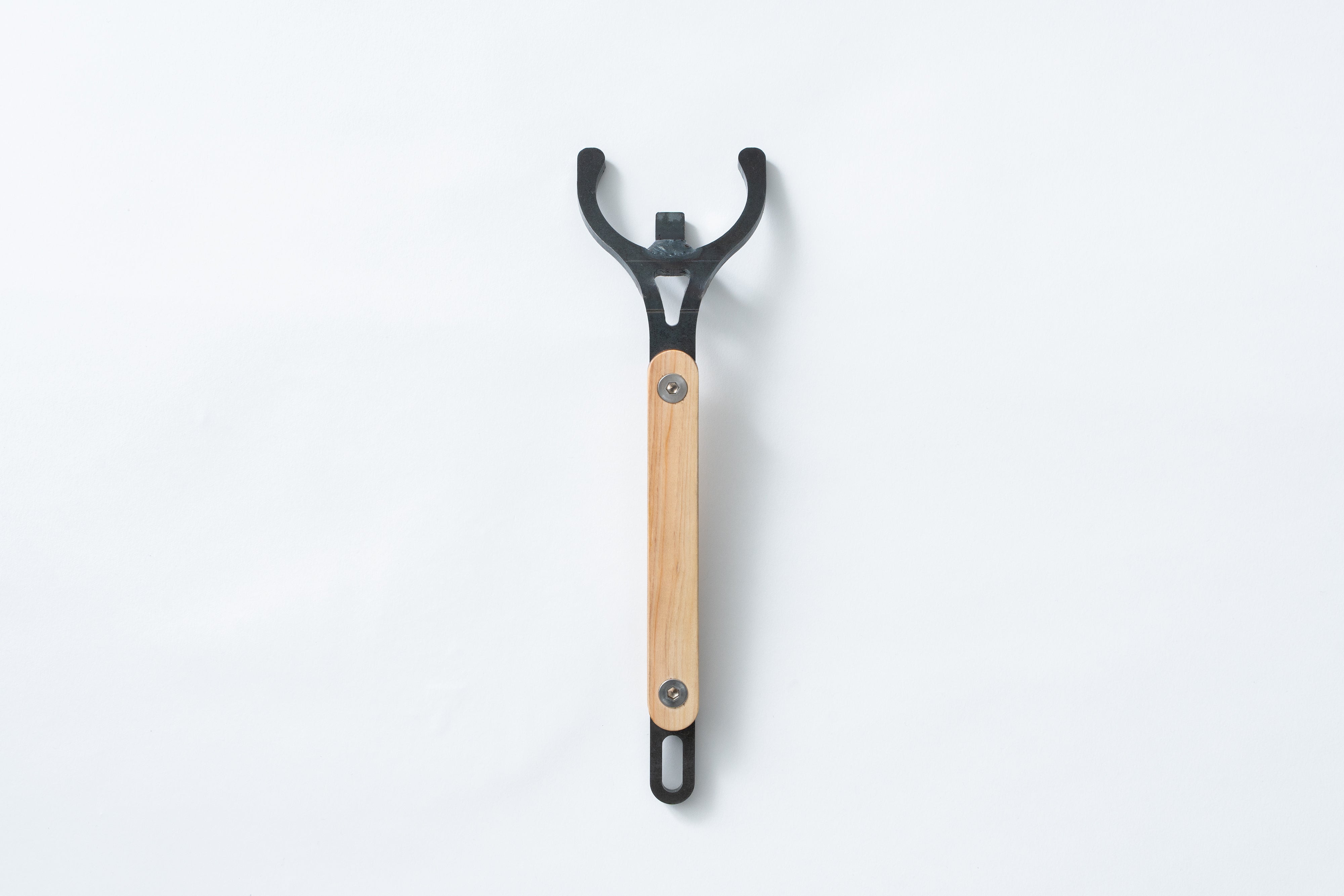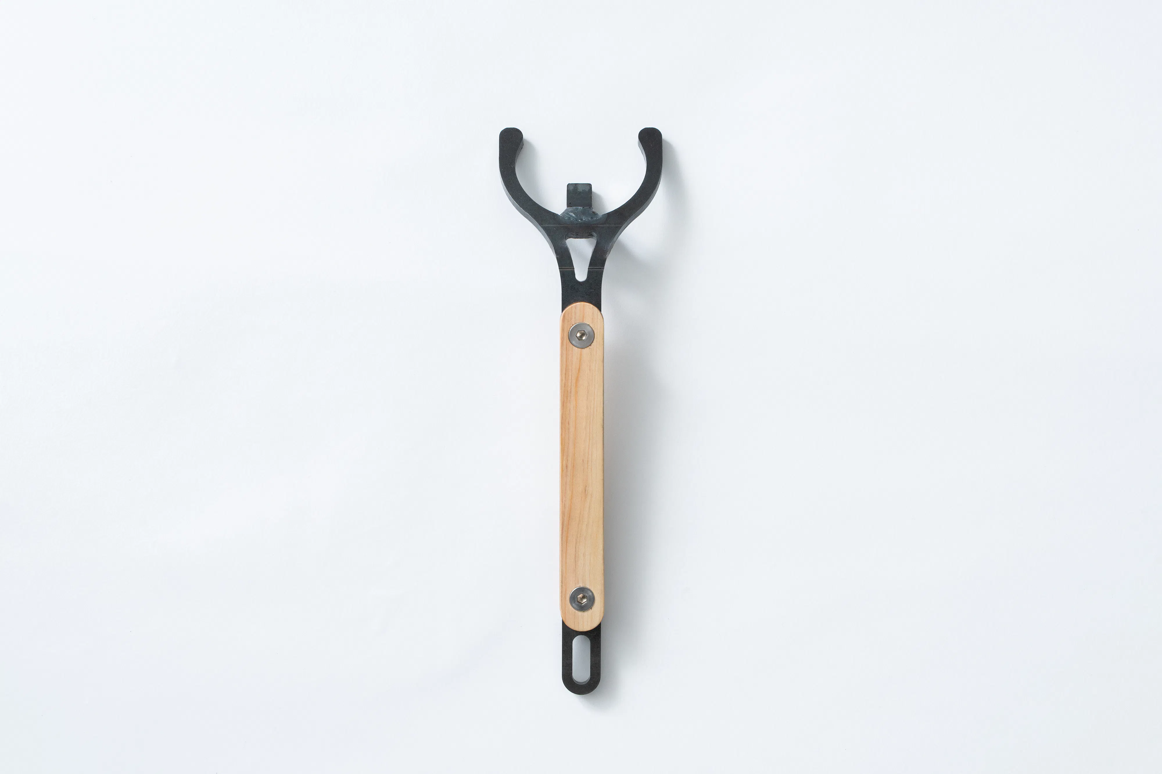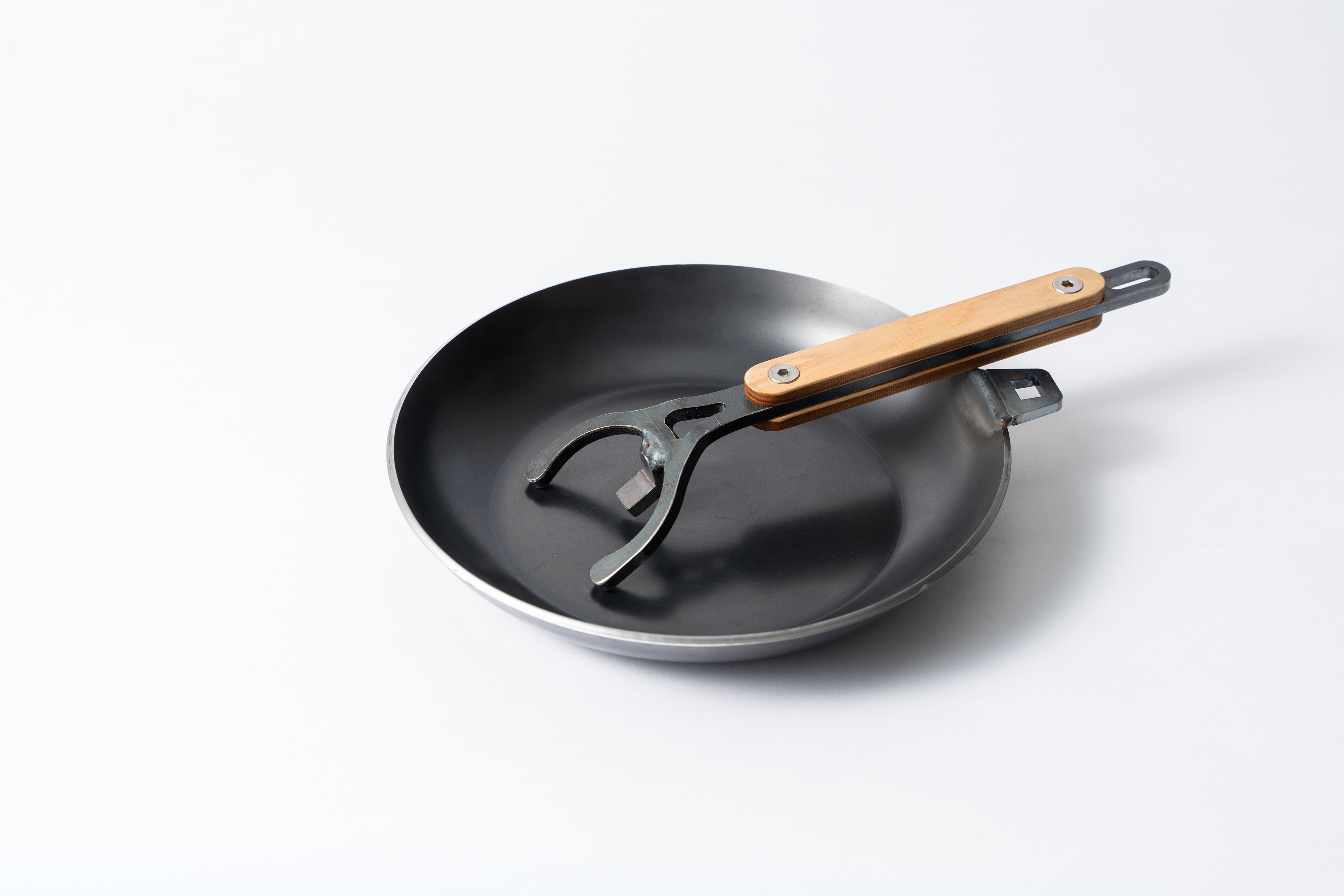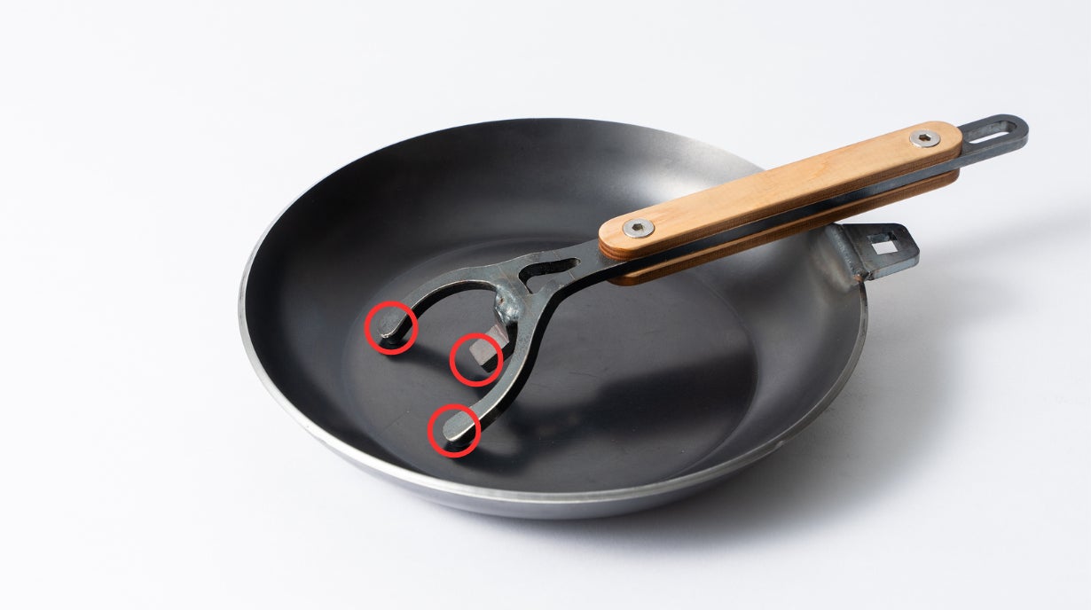 このフライパンは鉄製の本体と取っ手のみで構成されています。可動部やねじが無いため壊れようがない構造です。一方で、力学的に最も安定する三点支持で手の様にガッチリとフライパンを保持するため、シンプルながら抜群の安定感があります。
