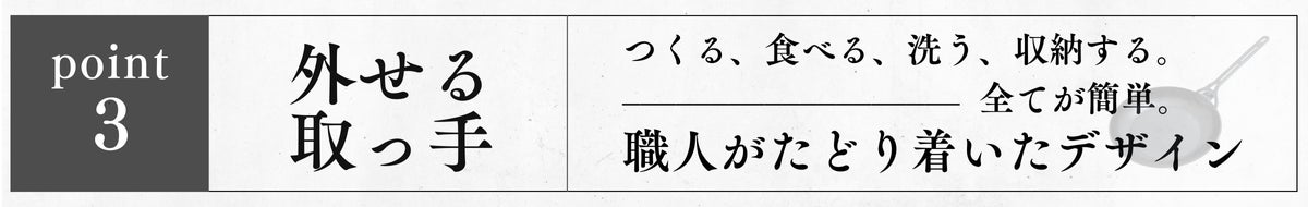 「いつでもどこでもおいしい料理を楽しめる」ことは使い続けていく上でには欠かせない機能。取っ手が外せることで、お家の小さなシンクでも簡単に洗うことができるのもワンポイントです。