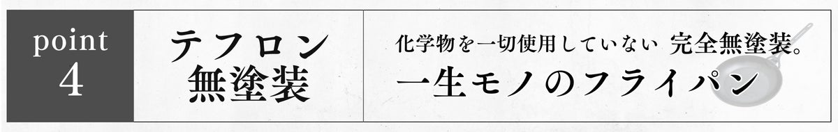多くのフライパンは表面を多種多様な化学物質で塗装しています。それらは多くのメリットがある一方で、製品の寿命を決める要因になってしまったり、使う中でどうしても塗装が脱落してしまい料理の中に混ざってしまいます。
