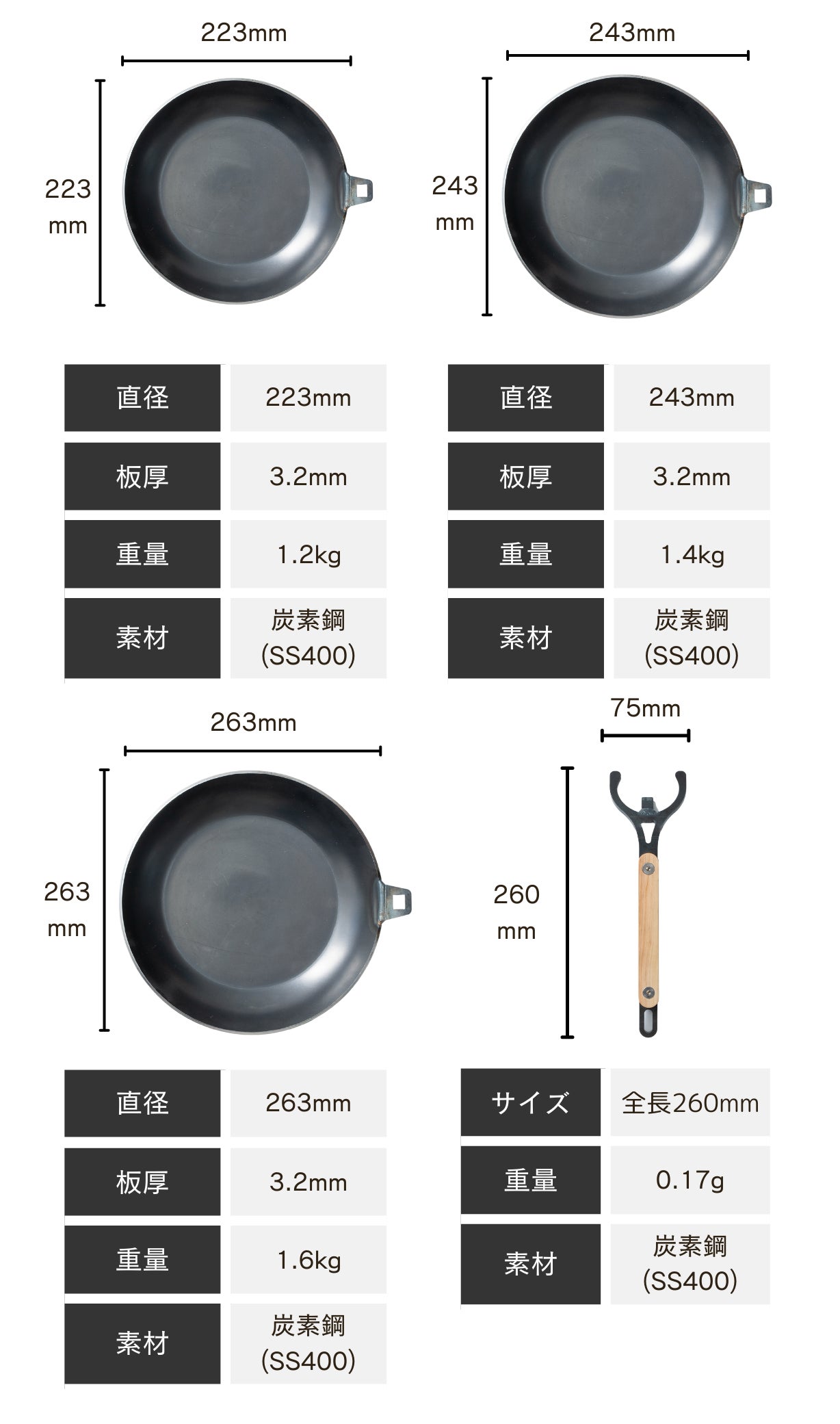 また、3.2mm厚の鉄板を使うことで、焚き火〜IHまで様々な熱源に対応できます。フライパンの底がデコボコになるとIHで上手く温まらなくなるため、通常の1.6mm厚フライパンだと1-2年で買い替えている方が多いのではないでしょうか?