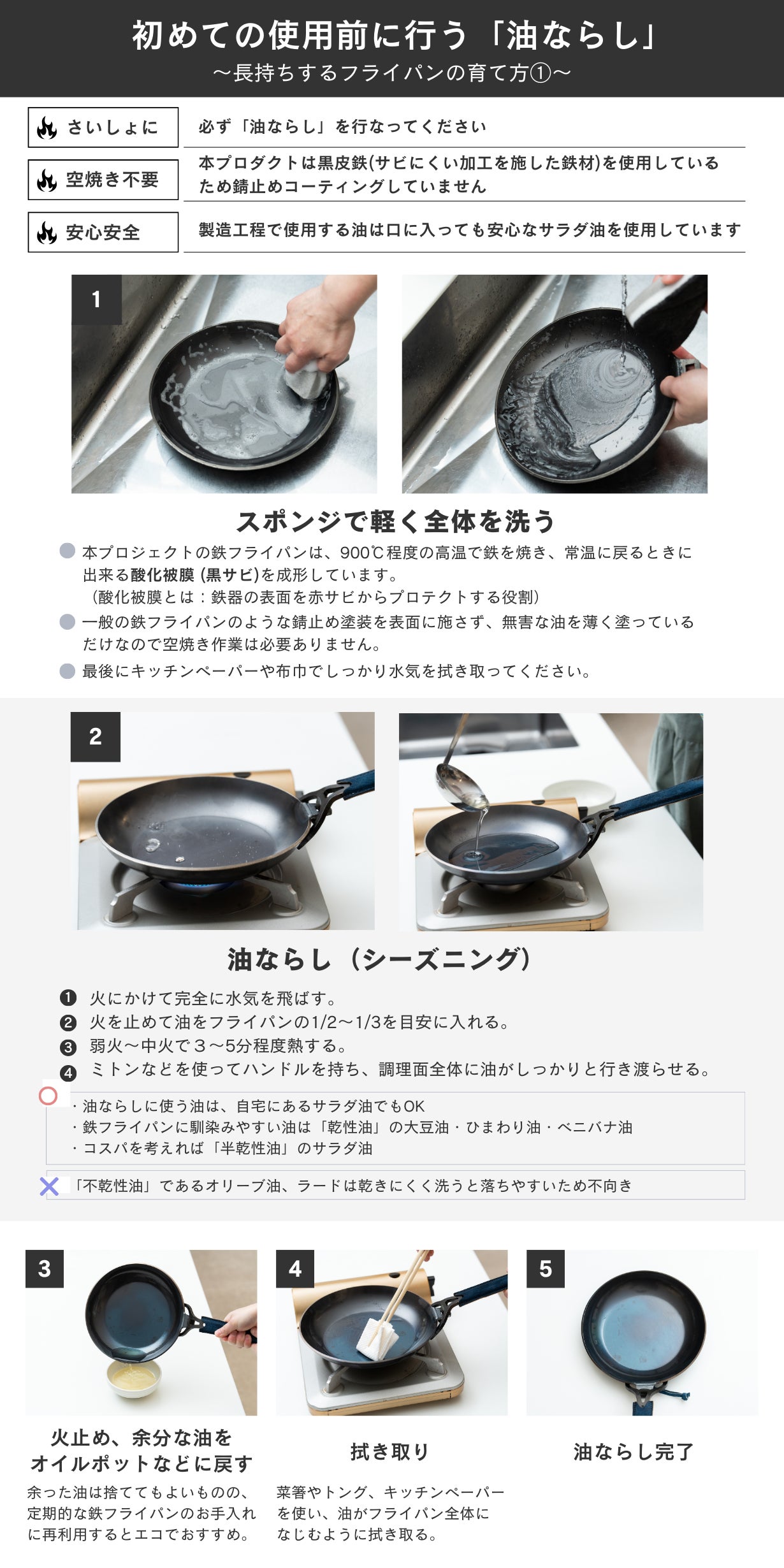 「鉄フライパンのお手入れ方法」を詳しく知りたい方はプロジェクトページの下部をご覧下さい。詳しくかいてありますが、基本的には「使用後はサッと洗い、よく乾かす」を実行していただくだけで問題無く使用できます。鉄フライパンをダメにしてしまう一番の原因は「使わないこと」。使わずに大事に保管するのではなく、毎日使ってあげれば繊細な手入れは必要ありません。