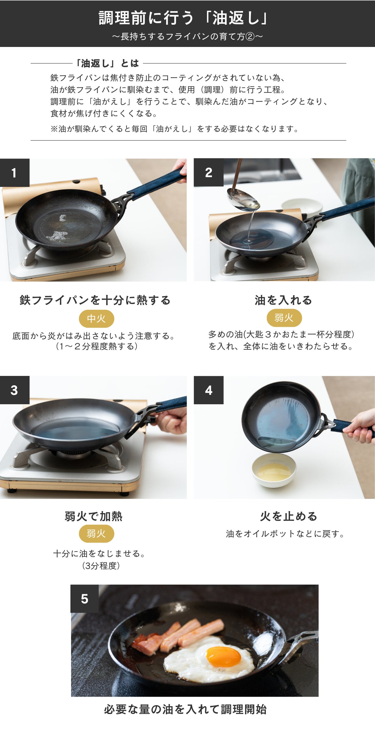 A. 油ならしと油返しをすることで永くご使用いただけます。やり方は簡単で、自分だけのフライパンを育てるのも鉄フライパンの魅力の1つです!初めのうちは「油返し」をして、スルスルな鉄フライパンを育てましょう。