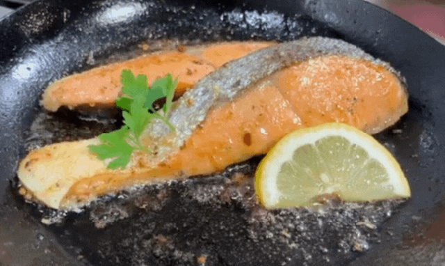 鮭のムニエルは、皮がこんがりと焼けてパリッとし、身はふっくらとジューシーです。