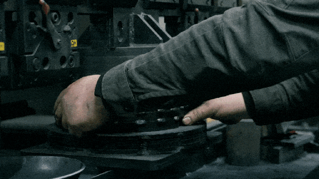 プレスでフライパンの形を作っていきます。設計、切り出し、プレス、全て一人で行います。