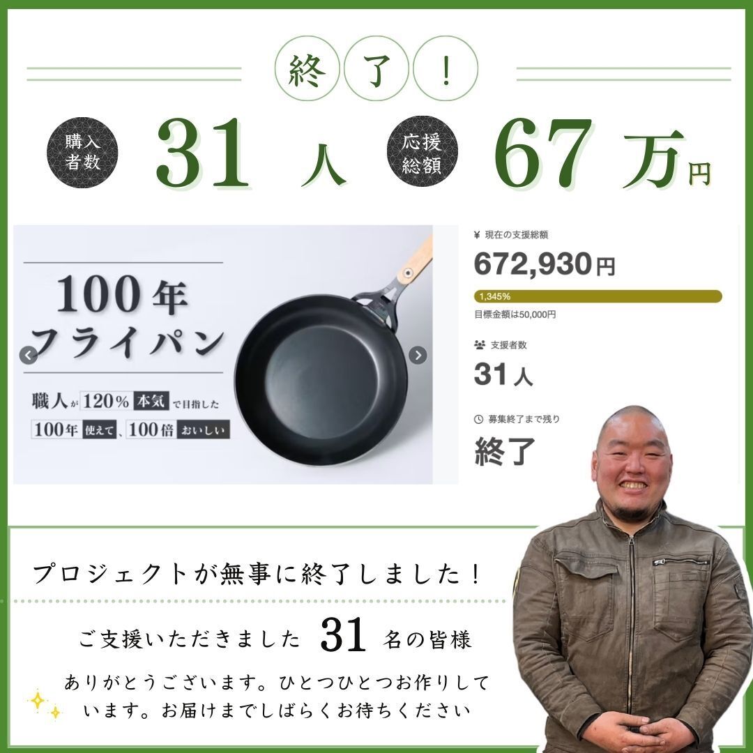 2024/12/26 18:30圧倒的に美味しく使いやすい愛媛の職人が作る【100年フライパン】プロジェクトが終了しました!応援してくださった皆様に感謝御礼申し上げます。31名の方々にご支援いただき総額は672,930円となりました!ご支援だけでなくあたたかいメッセージをたくさんいただきスタッフ一同、感謝の気持ちでいっぱいです。心より感謝申し上げます。本プロジェクトは、愛媛の職人さんとの協力してのプロジェクトです。職人さんの製品を多くの方に知っていただきたい!その技術を未来に繋げたい!という思いで始めた"職人むすび/愛媛"。多くの皆様に賛同していただけて大変嬉しく、ありがたく思っております。この【100年フライパン】がお手元にあることで、皆様の食卓が、特別なものになることを祈っております。職人むすび/愛媛は今回のプロジェクトを含めさらなる成長と発展ができるよう、真摯に取り組んでまいります。今後も「愛媛の職人」を応援する商品を作ってまいりますので、引き続き応援のほどよろしくお願い申し上げます!進捗は随時、活動報告でご連絡致しますね!商品が届くまでもうしばらくお待ちくださいませ。▼口コミ・職人さんと共に挑戦する日常(instagram) https://www.instagram.com/ehime.craftsman/ もっと見る【残り5時間】”100年フライパン”お試しレポート16 | 大忙しのミルクレープ