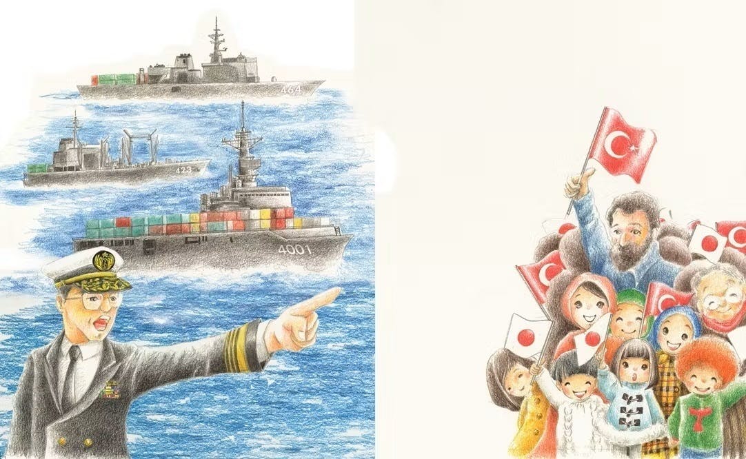 2024/12/07 07:00この絵本をつくっているさなかの2023年2月6日、トルコ南東部でマグニチュード7.7と7.6の大きな地震がつづき、日本はいち早く救援隊や医療チーム、専門家チームを送りました。たくさんの犠牲者がでた悲しい出来事ですが、トルコと日本の強いきずなは、いまでも続いています。それはエルトゥールル号の沈没事故から続いているのです。「分断される世界」という言葉が聞かれるようになる、この時代だからこそ、両国の歴史をしっかりと伝え、残していきたいーそう願って、絵本を一冊いっさつ丁寧に届けていきます。ご支援、ご協力をどうぞお願い申し上げます。1999年〈平成11〉トルコ北西部地震1999年8月17日、トルコ北西部で発生したマグニチュード7.6の地震は37秒もの間ゆれ続け、1万7000人あまりが死亡し、およそ60万人が家を失いました。この地震で日本政府はトルコの被災民救援のため、プレハブ500戸を自衛隊の艦船でトルコへ輸送しました。トルコに向かうプレハブを搭載したコンテナを載せた自衛艦2011年〈平成24〉東日本大震災2011年の東日本大震災では、トルコ政府が救助チーム32人を派遣します。宮城県内でおよそ3週間の救助活動を行ったほか、缶詰およそ6万個、水およそ18.5トン、毛布およそ5,000枚が宮城県や福島県の被災地に届けられました。活動期間は約3週間で、海外の救助隊の中で最も長かったとされています。100年以上にも及ぶ両国間の助け合いの歴史、そして心の交流を、いま生きる子どもたちに知ってもらいたい。そしてこの国際交流が次の100年、その次の100年と続いていくことを願い、この本の出版と配布の支援を決意しました。 もっと見る