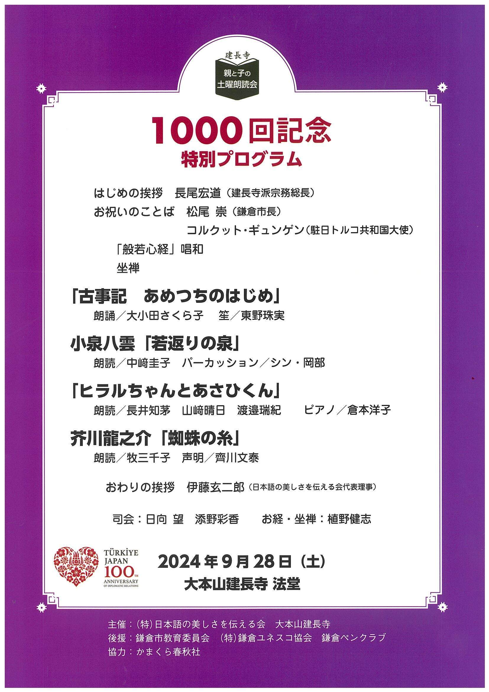 NPO法人「日本語の美しさを伝える会」が2005年より名作朗読を耳から聞くことで子どもたちに日本語の美しさと物語のおもしろさを伝えようと毎週土曜日鎌倉・建長寺で開催している 「親と子の朗読会」が1000回を迎えました!