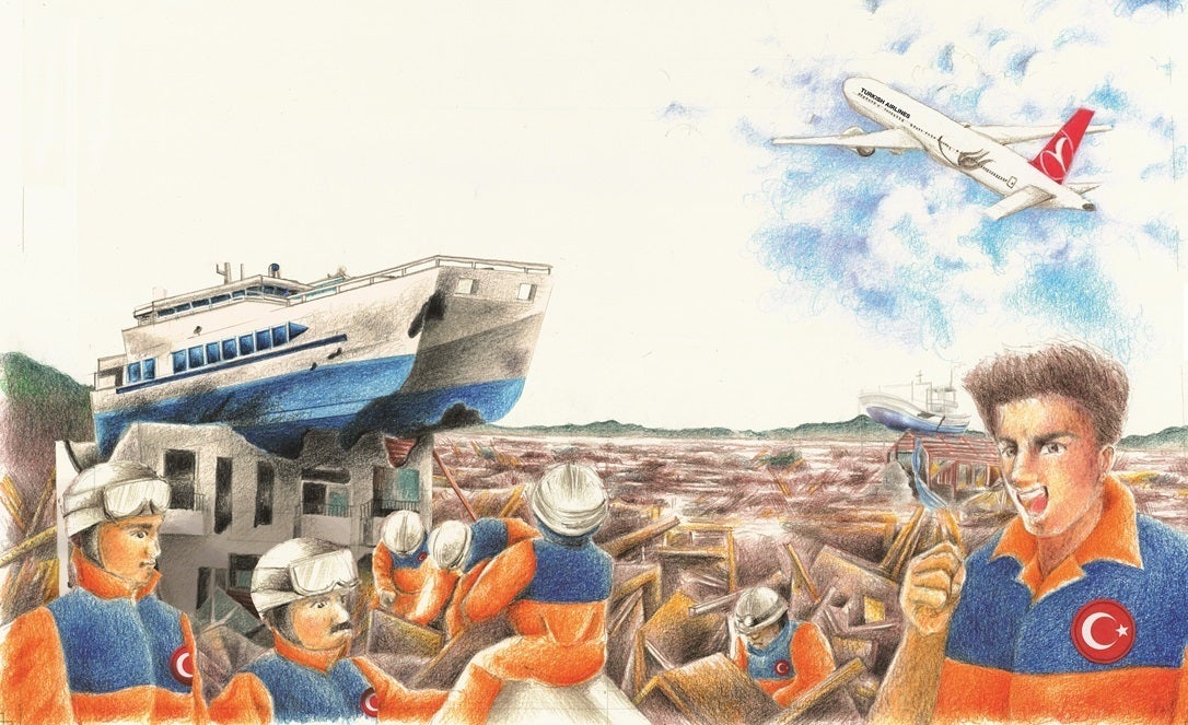 この絵本をつくっているさなかの2023年2月6日、トルコ南東部でマグニチュード7.7と7.6の大きな地震がつづき、日本はいち早く救援隊や医療チーム、専門家チームを送りました。