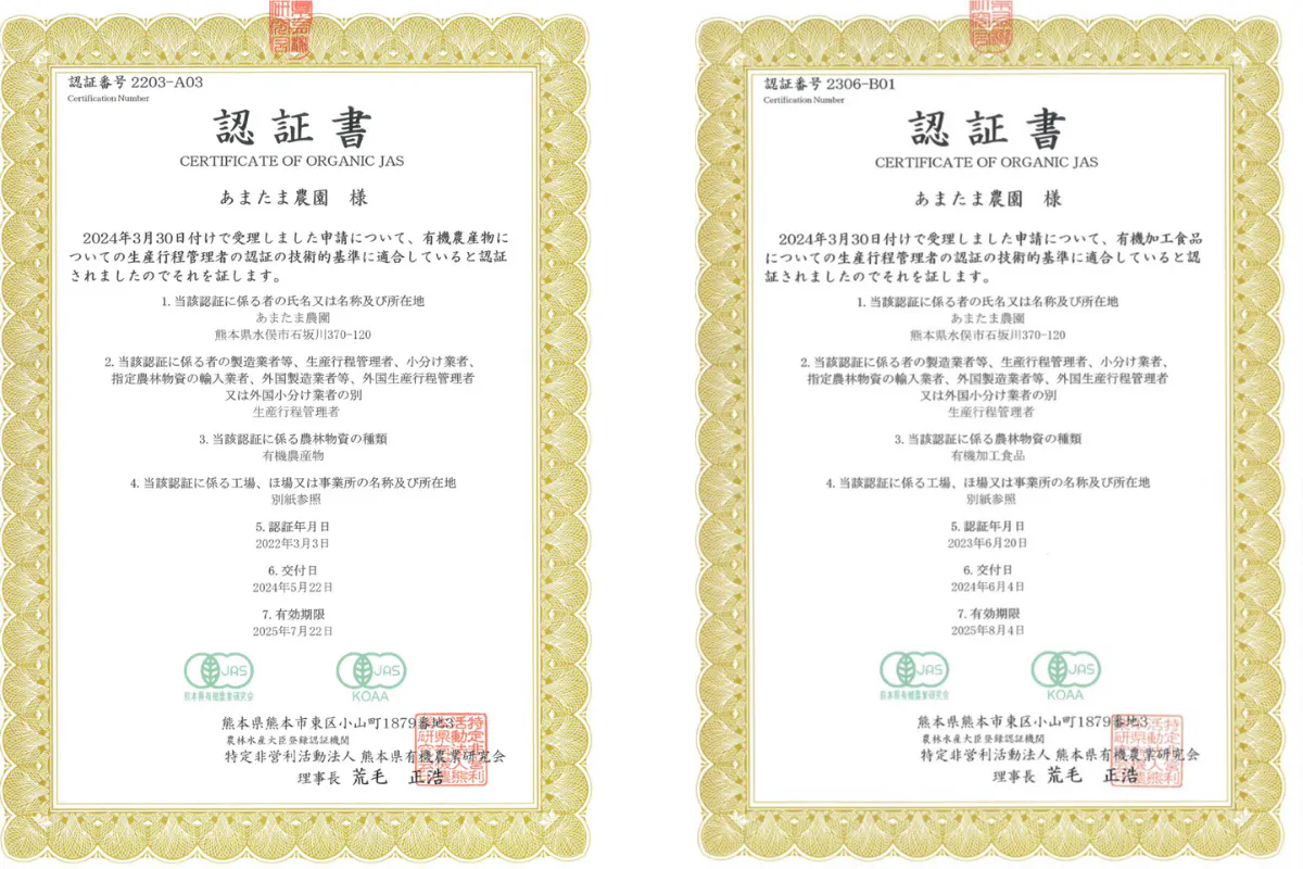 有機JASの認定証です。この認定証を持っていないと、【有機・オーガニック】という表記は出来ません。審査も毎年来ていただき、厳正なる審査の上 【認 定】 となります。1年間の管理記録や栽培記録、使用した機械の履歴、出荷の履歴など、ほんとに厳しい審査を通らないと【有機・オーガニック】と使えないようになっています。