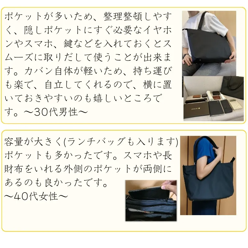 女性の通勤バッグのニーズをヒアリングしながら開発しましたが、男性にも使いやすいユニセックスな機能と仕様にしています。