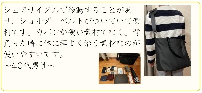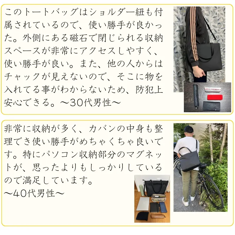 仕事でパソコンを持ち歩く方、外回り・出張が多い方、自転車で通勤する方、手荷物が多い方、現在のバッグに物足りなさを感じている方におすすめです。