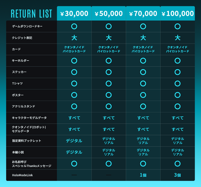 高度な人工知能(AI)を備えたアンドロイドをテーマとした本作ならではのリターンとして支援者さまのご希望の名前でキャラクターがお礼をお伝えします。