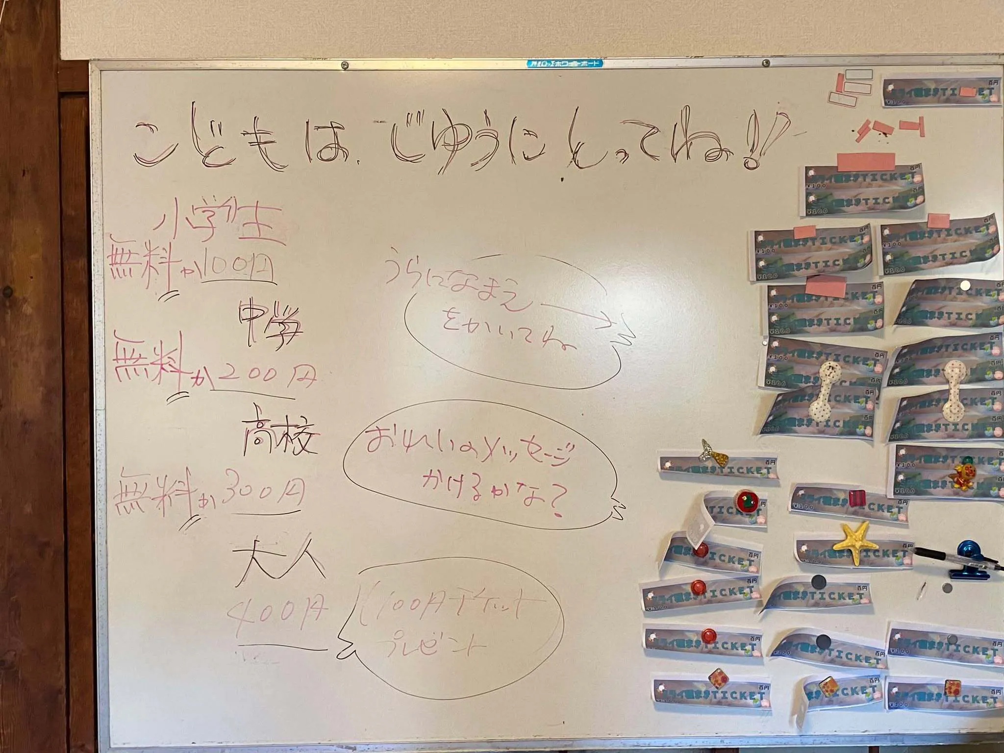 クラウドファンディングで支援頂いた費用から、チケットを貼っておきます。子どもたちが、100円を持ってこなくてよいように、チケットの寄付を沢山、ホワイトボードに張り付けておきたいと思っています。よりたくさん、貼ってあげれるよう皆さん、ご協力お願いします。