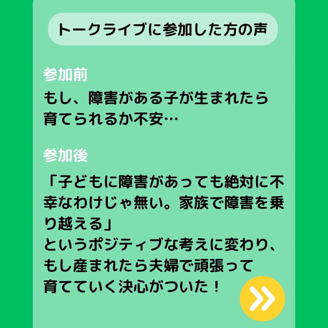 これから生まれてくるかもしれない子どもに障害があったら育てられるか不安に思っていた中で、このトークライブを見つけて参加してくださいました。トークライブをご夫婦で聞いた後、「子どもに障害があっても絶対に不幸な訳ではない。家族で障害を乗り越える!」と2人で決心ができたとご報告いただきました。