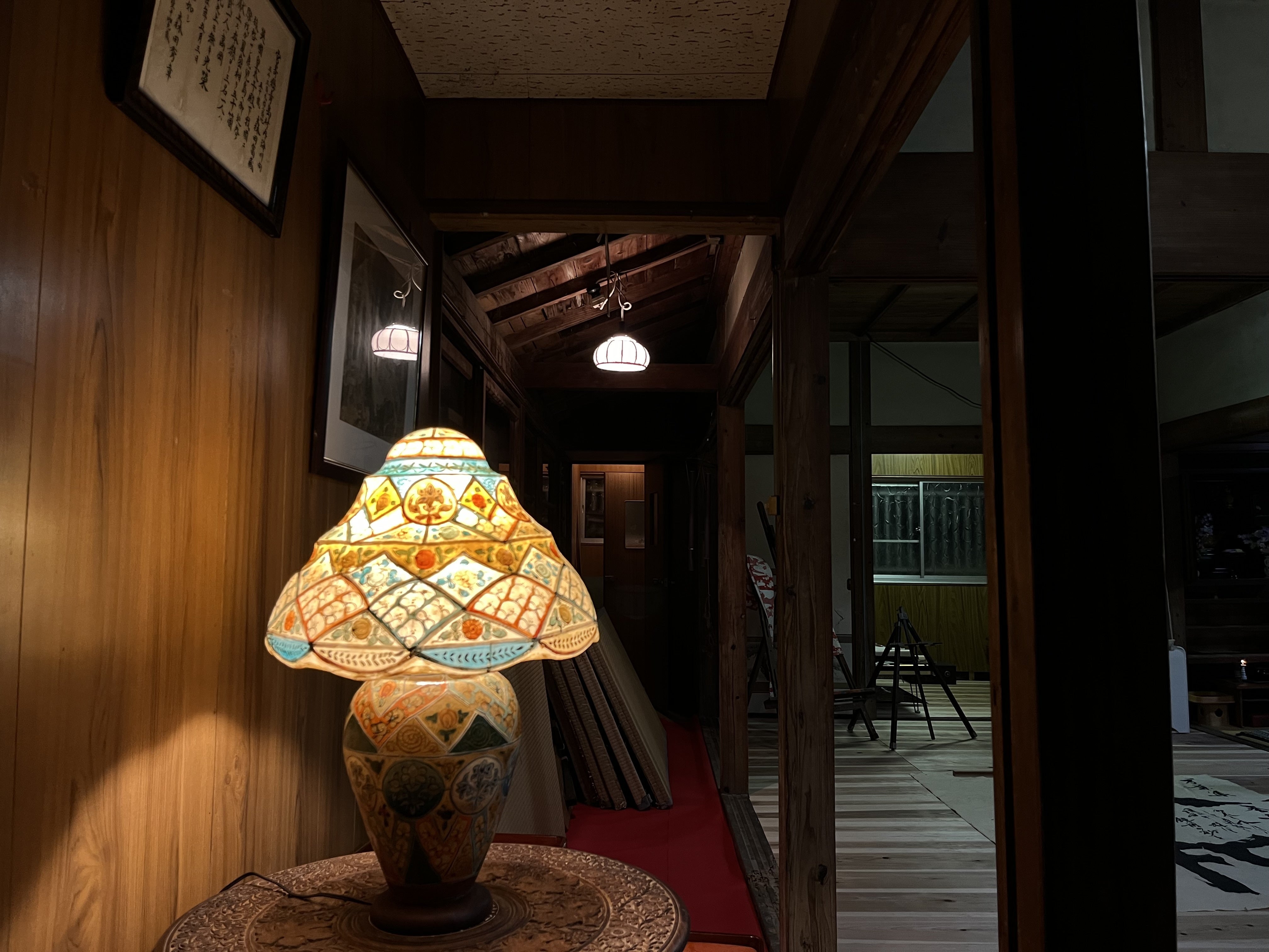 ラクダの胃袋で作っているのですが、なかなか古民家の雰囲気にマッチしています。奥にあるのが大正時代に使われていたアンティークランプです。廊下が一気にタイムスリップしたみたいです。