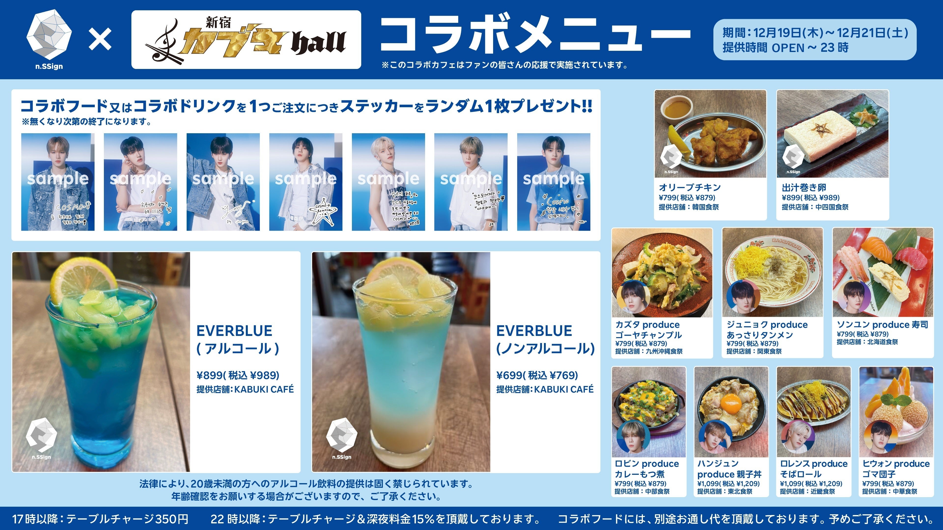 来る12月19日(木)から12月21日(土)の3日間、ファンの皆様の応援で実施する、n.SSign歌舞伎町タワーコラボイベントを実現予定です。内容は以下をご参照ください。■EVER BLUE衣装展示 11:00~19:00EVER BLUEで使用した衣装を歌舞伎ホールステージに展示します。■カブキホール ディスプレイ映像放送 10:30~19:30カブキカフェステージ上部のモニターに、n.SSignのミュージックビデオ等が放映されます。■カブキホール飲食店スペース ディスプレイ放送 20:00-23:30を除く営業時間中15分に一回程度想定 約60秒間EverblueのPV+コラボメニューの紹介動画が放映されます。※各時間帯で放送されるタイミングは以下の予定です。(2024/12/17追記)毎時5分〜、20分〜、35分〜、50分〜。ただし初日は11時から開始、19時50分の配信はありません。23時半以降の夜間も放映予定です。※放映時間は予告なく変更となる場合がございます※周囲の通行人に十分ご配慮ください。■コラボメニュー販売 各店OPEN~23:00カブキホールの飲食店各店で、メンバーコラボのフード・ドリンクメニューが販売されます。コラボメニューを注文された方には、メンバーステッカーをランダムで1枚プレゼント。※なくなり次第終了■屋外ビジョン ディスプレイ放送 以下の時間帯で、歌舞伎町タワー外壁の大型ビジョンにもn.SSignからのメッセージが流れます。※各時間帯で放送されるタイミングは以下の予定です。(2024/12/17追記)19日(木)7:00~18:00、21:00~25:0020日(金)7:00~25:0021日(土)7:00~14:00、20:00~25:00各時間帯における放映時間 1分、16分、23分30秒、31分、46分、53分30秒※放映時間は予告なく変更となる場合がございます。※ビジョン前に訪れる際には周囲の通行人に十分ご配慮ください。東急歌舞伎町タワーはこちら▼https://www.tokyu-kabukicho-tower.jp/カブキホールはこちら▼https://kabukihall.com/当日現地に行ける方は、ぜひご覧いただければ幸いです。