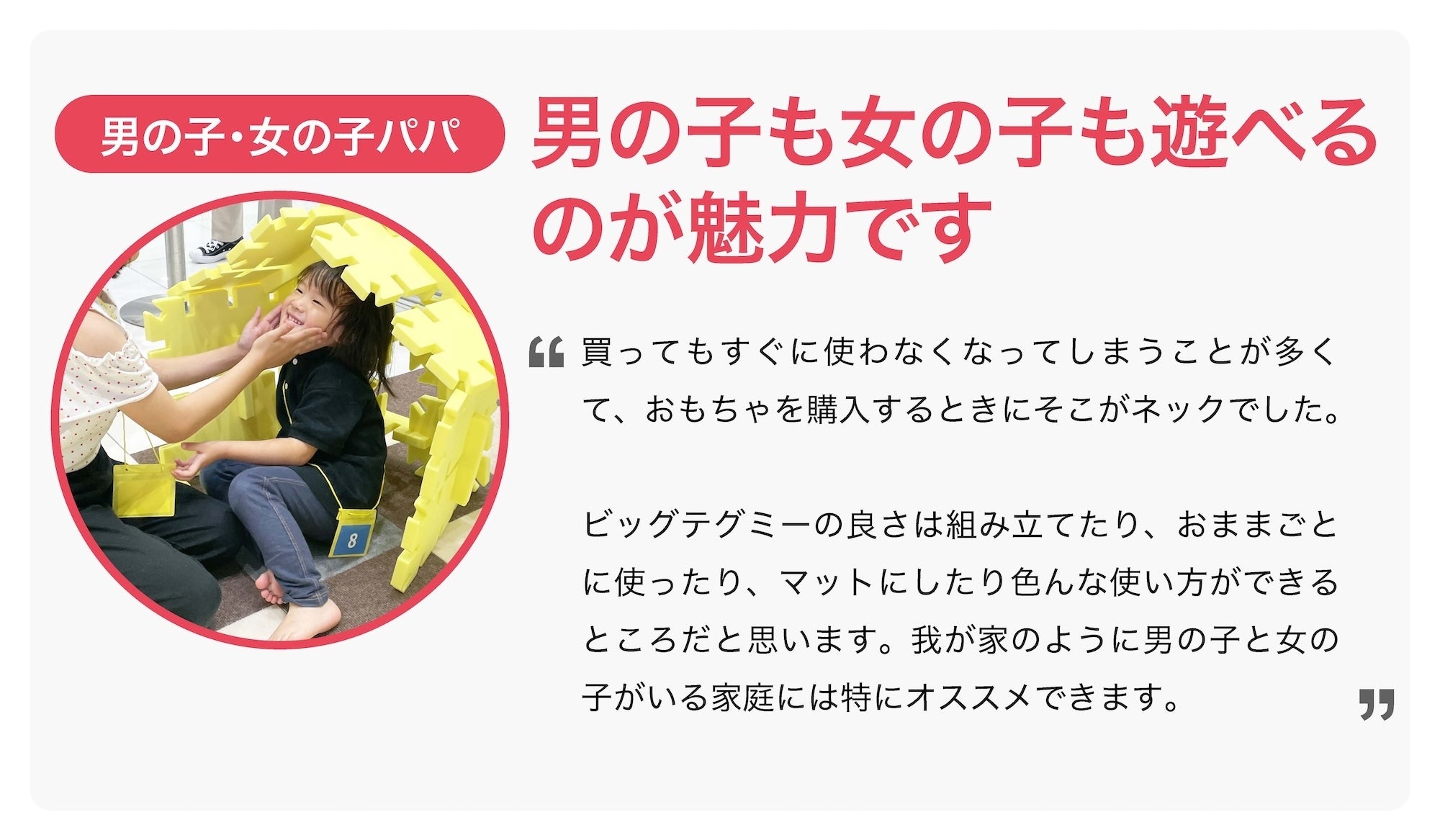 幼児、大人、高齢者、みんなが楽しく組み立てられるビッグテグミーなら、欲しいものを作り出す過程すら遊びになります。不便さの解消と、安らぎの提供、両方を実現できると考えています。加えてビッグテグミーは軽く柔らかい素材のため、避難所での静かな遊びが可能な点もオススメのポイントです。