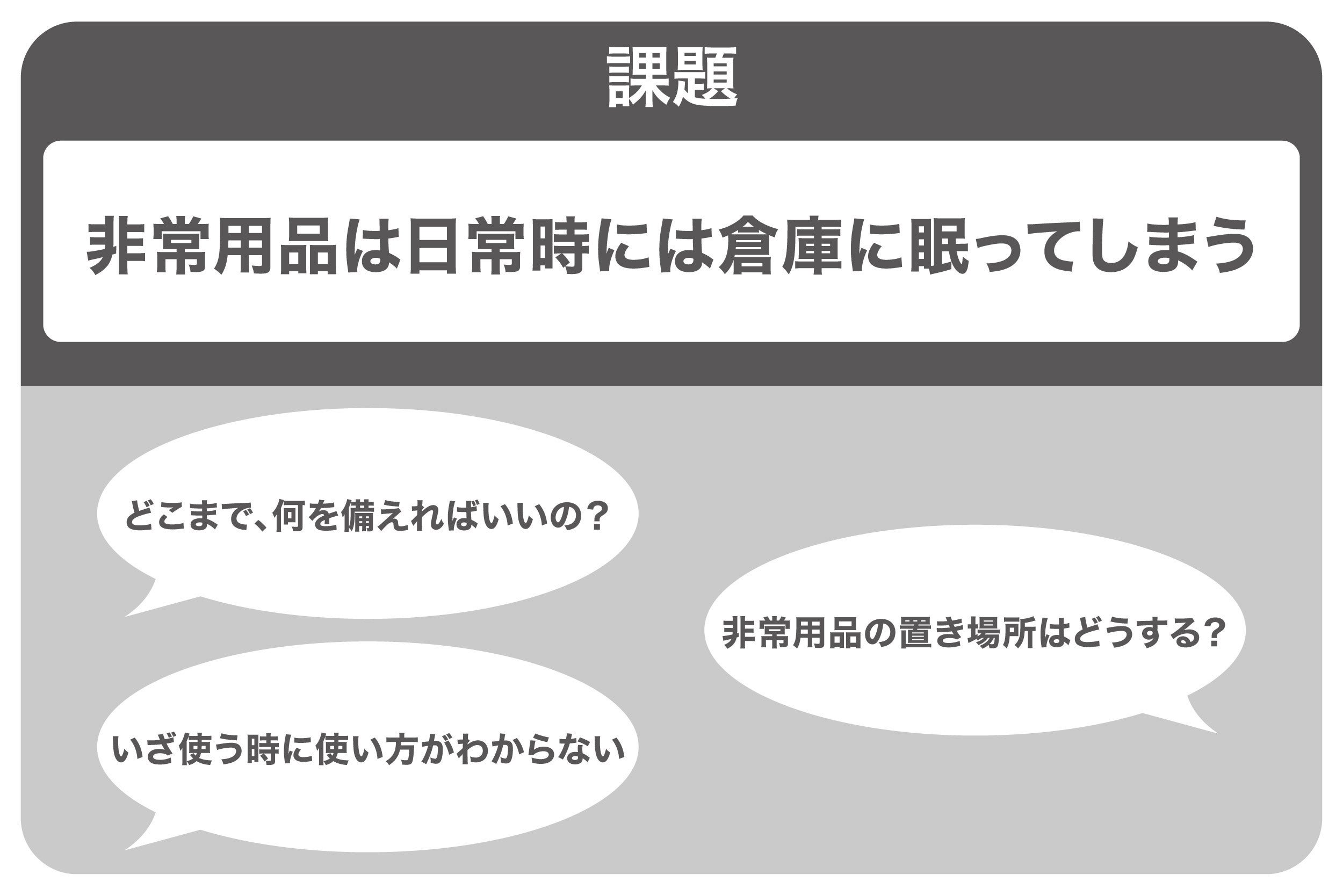 防災用品のほとんどは、ふだんはしまっていて、非常時のみに取り出して使うものです。フェーズフリー品はちがいます。フェーズフリー品は日常時のいつもの生活で便利に活用できるのはもちろん、 非常時のもしもの際にも役立つ商品・サービス・アイデアです。