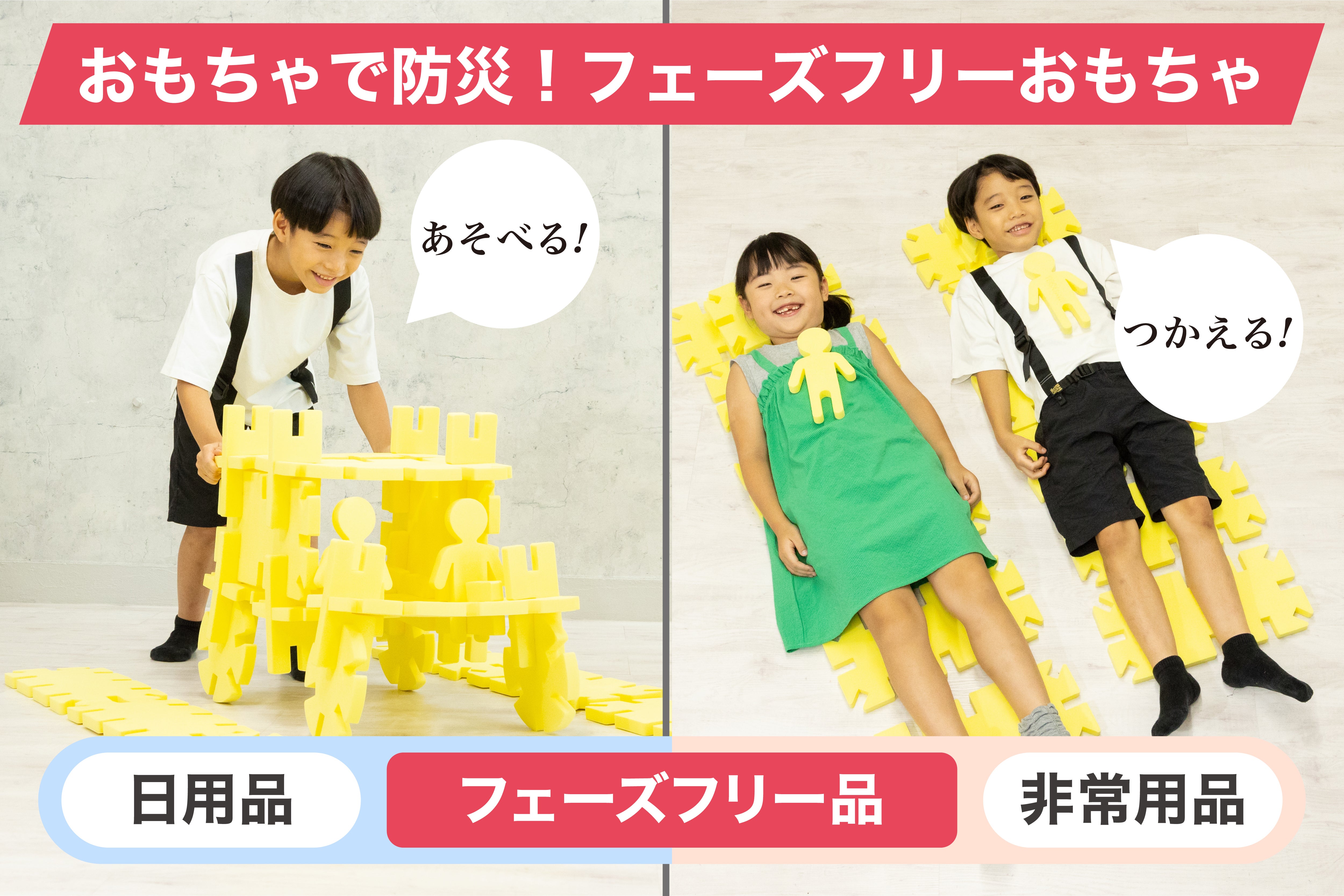 ビッグテグミーはフェーズフリー認証(PF認証)を取得しました。フェーズフリー認証(PF認証)とは、商品やサービスが日常時も非常時も価値を持つことを一般社団法人フェーズフリー協会が認証する制度です。楽しいおもちゃとしてのビッグテグミーが非常時には、足りないモノの代わりや避難所での遊びの機会の提供など、実生活と心の両方を支えるプロダクトになります。