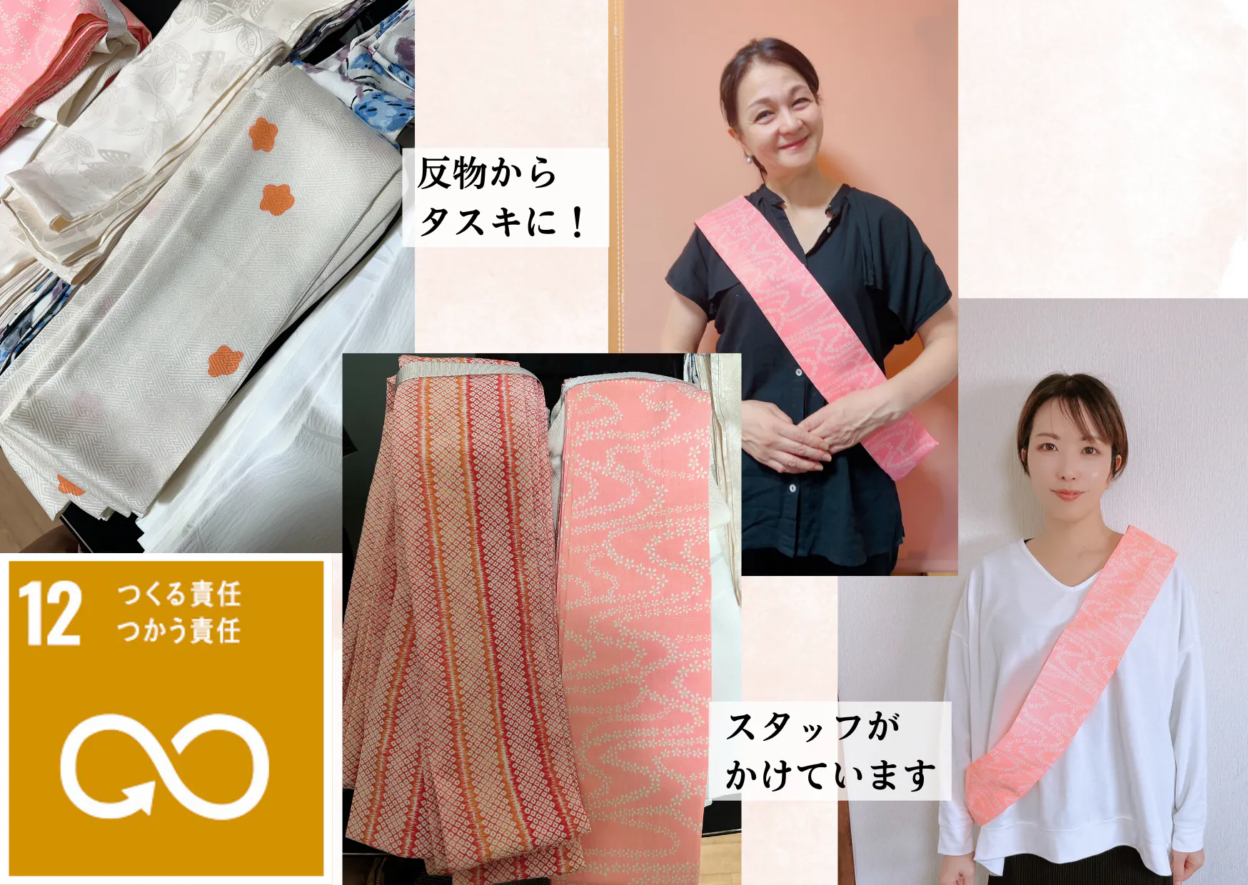 今回は私達ならではの取り組み、反物をタスキにしてスタッフとわかるようにかけています。