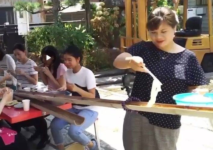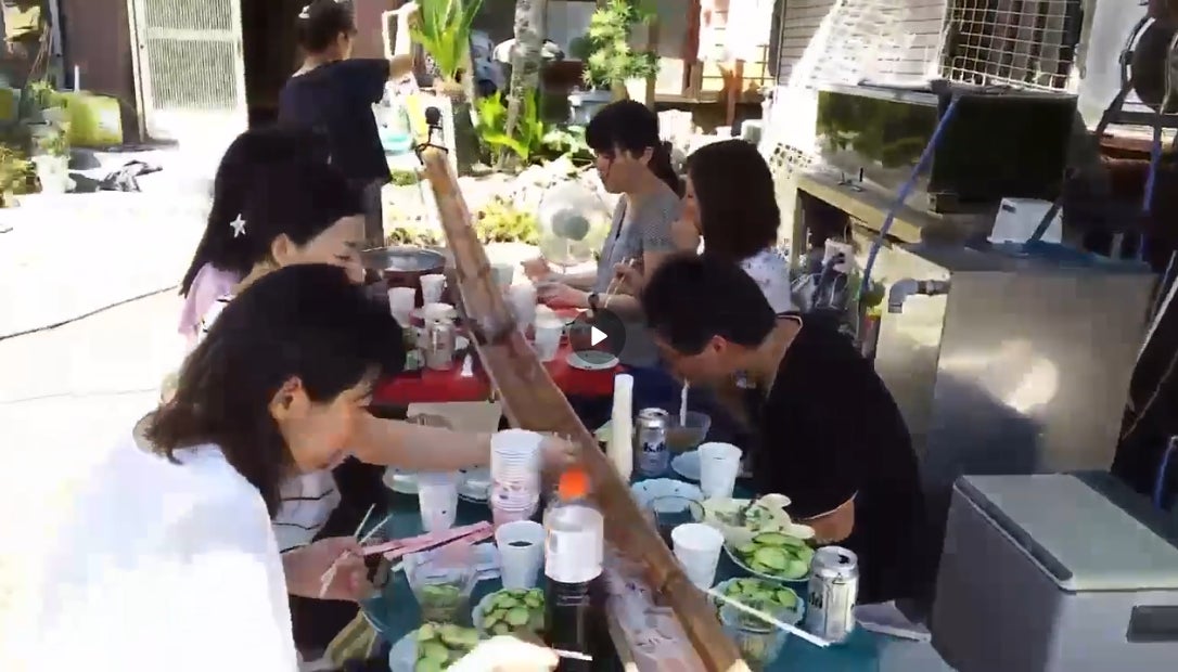 これは、外国の皆さんに流しそうめんを体験してもらった時の写真です。