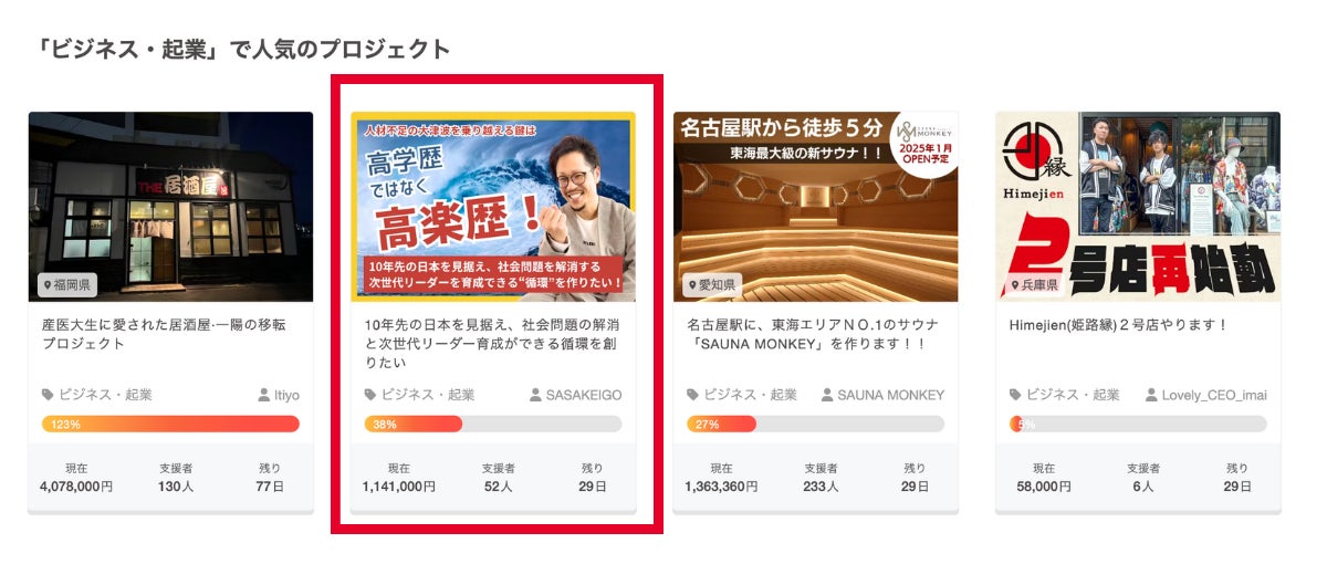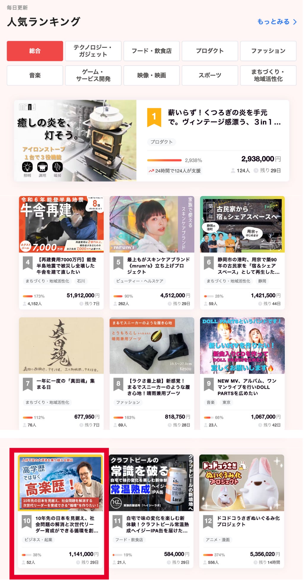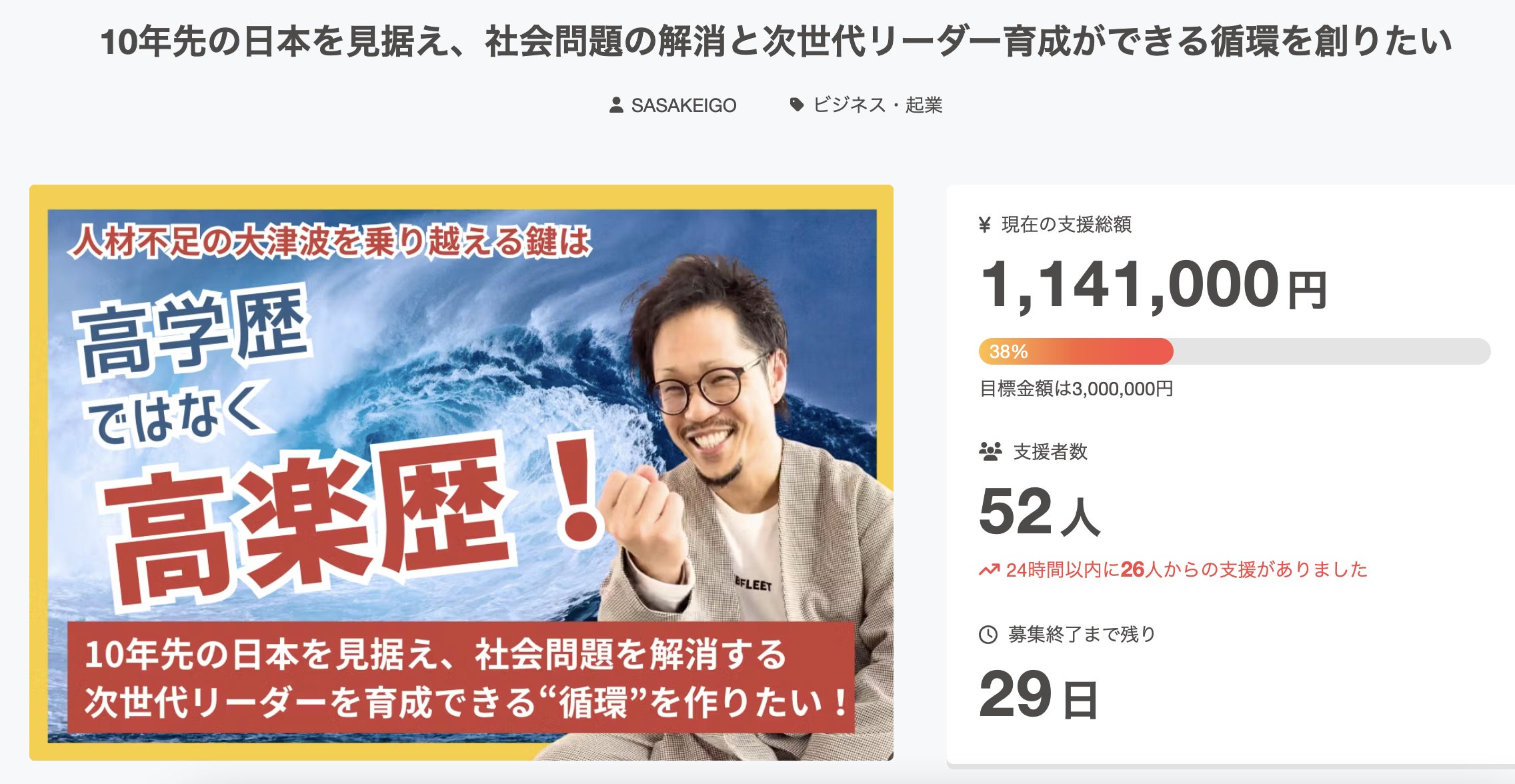 現在、52名のあなたからご支援をいただき、目標達成率38%まで押し上げていただいています。また、お気に入り登録、SNSシェア、ご紹介をしてくださるあなたのおかげで、CAMPFIRE人気ランキングの「総合ランキング」で10位、「ビジネス・起業カテゴリー」で2位にランクインしております!