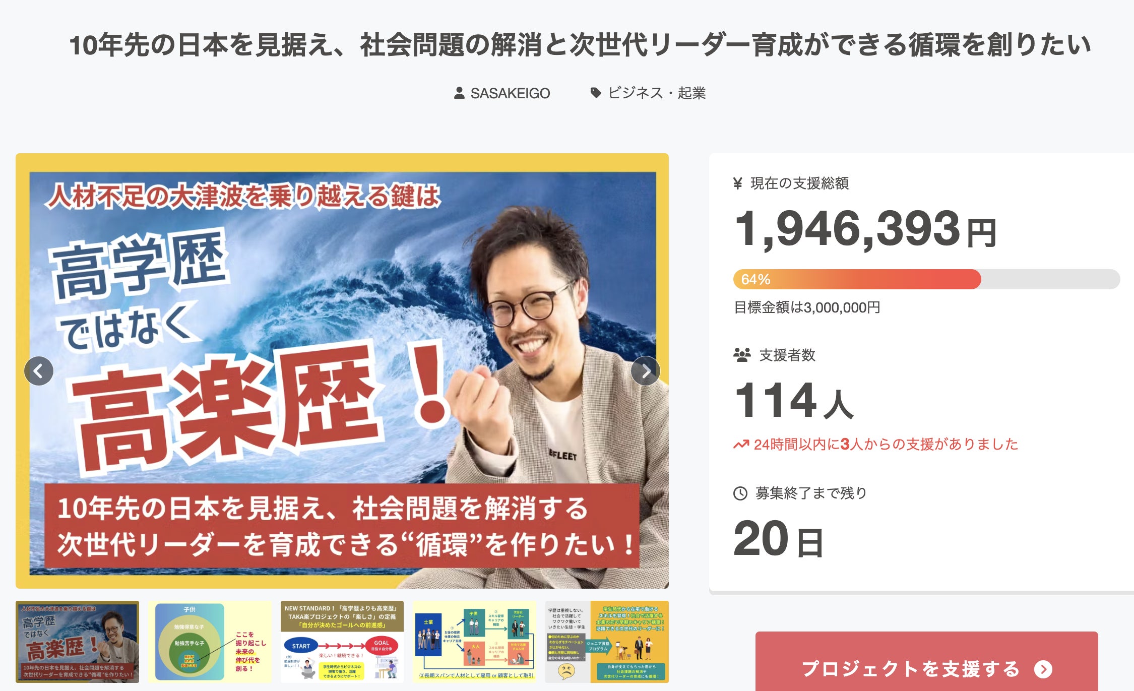 114名のあなたのご支援いただいております!プロジェクトを共に盛り上げていただき感謝しかありません!引き続き、「お気に入り登録」、SNSシェア・クチコミでの応援よろしくお願いします!