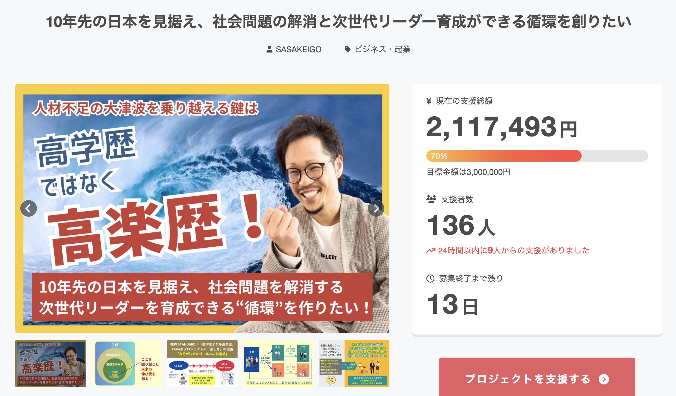 クラウドファンディングは現在、136名のあなたからご支援をいただき、目標達成率70%となっております!SNSでのシェア、ご紹介ありがとうございます!