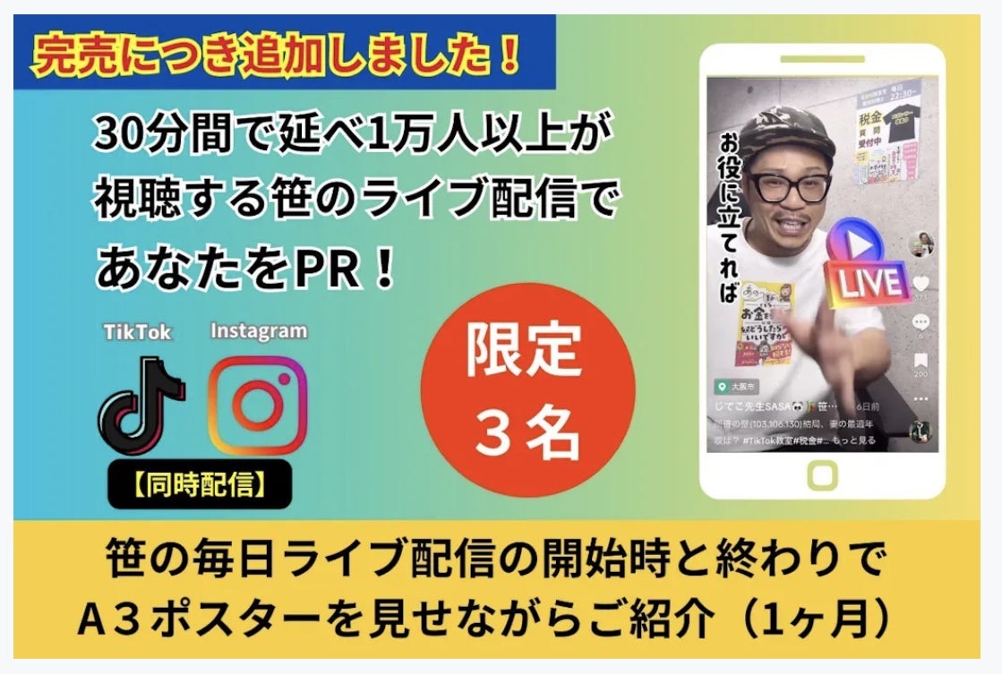 毎日22時から30分間、TikTok・Instagramでおこなっているライブ配信の開始時と終わりでA3ポスターを見せながら1ヶ月間、貴社と商品・サービスなどをご紹介します。