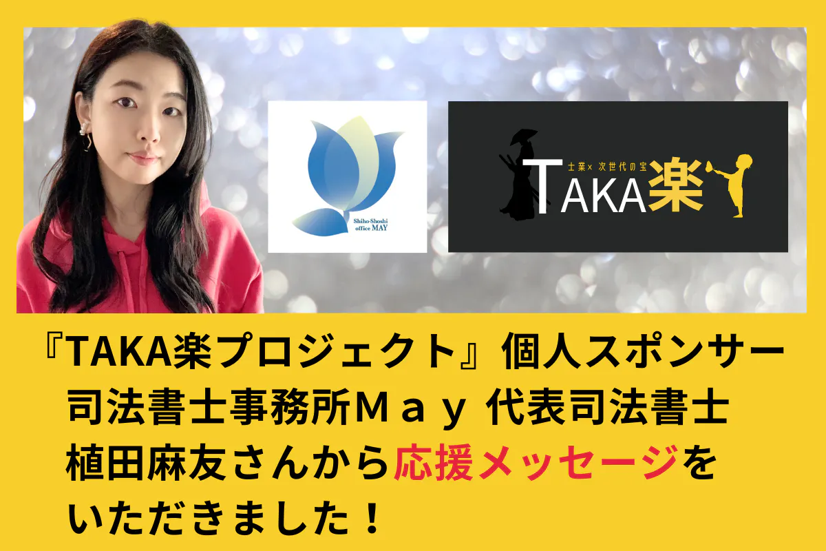 「TAKA楽プロジェクトスポンサー」の司法書士事務所May 代表司法書士 植田麻友さんから応援メッセージをいただきました!