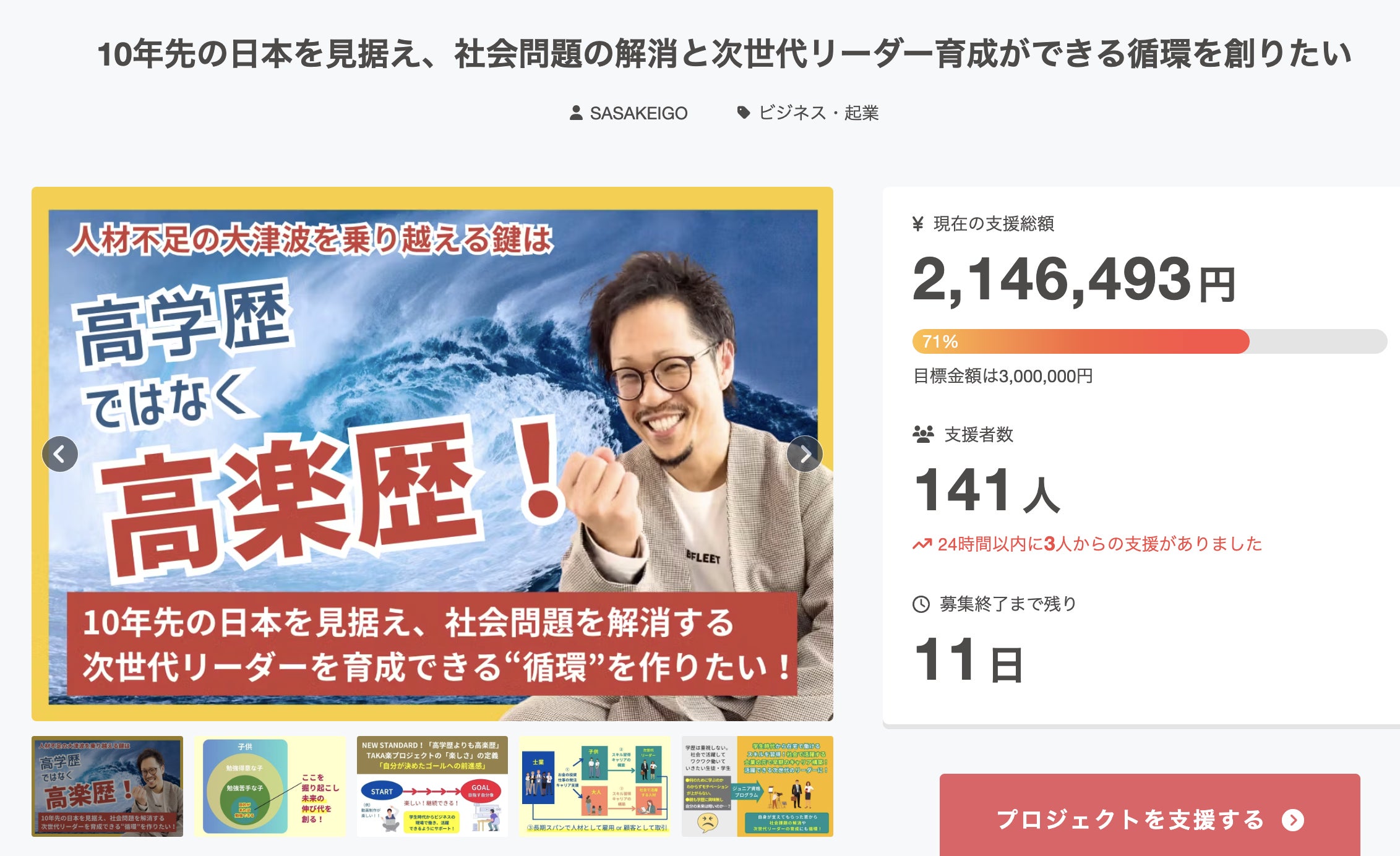 クラウドファンディングは現在、141名のあなたからご支援をいただき、目標達成率71%となっております!SNSでのシェア、ご紹介いただいているあなたのおかげです!本当にありがとうございます!