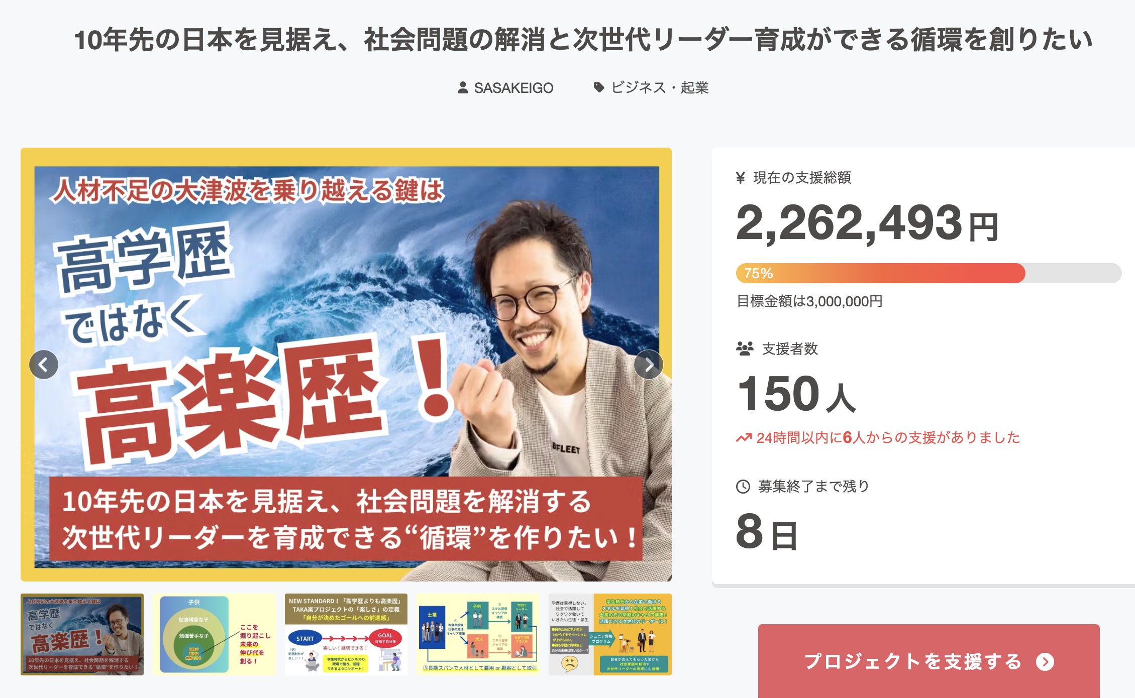 クラウドファンディングは現在、150名のあなたからご支援をいただき、目標達成率75%となっております!ご支援、応援ありがとうございます!