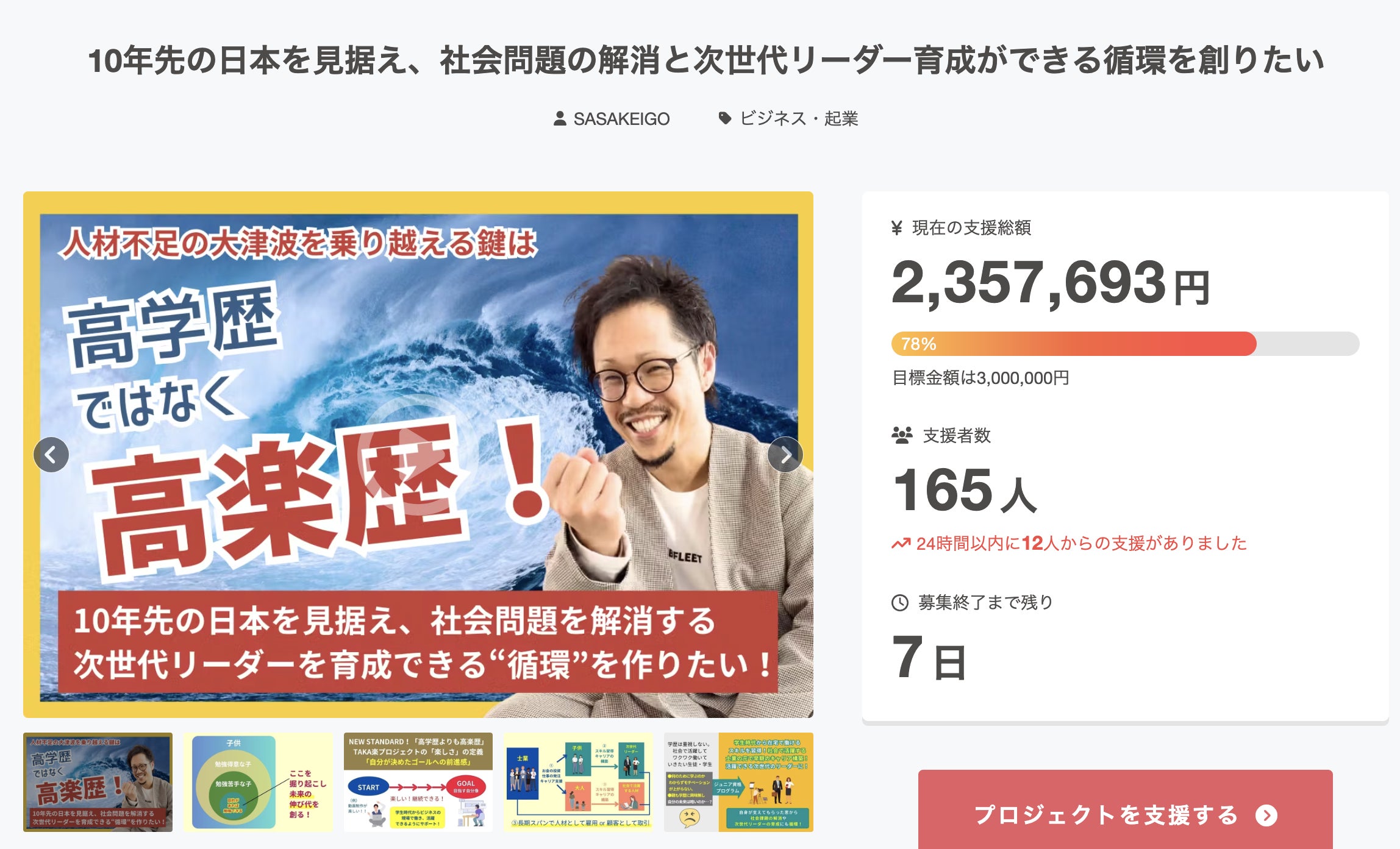 目標をクリアし、10年先の日本を見据え、社会問題の解消と次世代リーダー育成ができる循環を創りたい!!!ぜひ、お力添えくださいませ!!