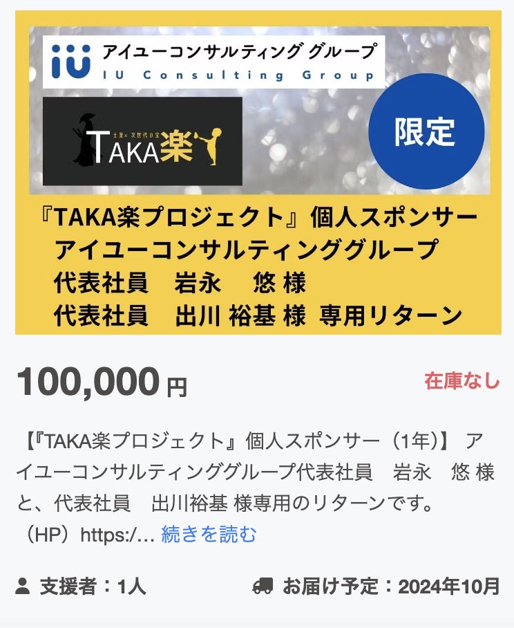 志を共に『TAKA楽プロジェクトスポンサー』としてご参加いただくあなたのことを知っていただきたいという想いから、アイユーコンサルティング様の専用リターンのように、
