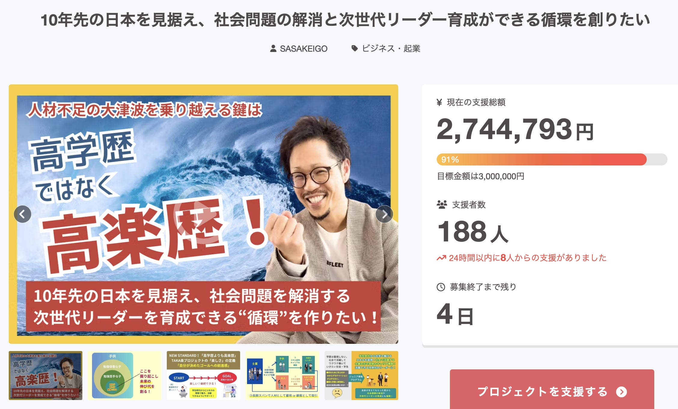 クラウドファンディング、現在188名のあなたからのご支援をいただいておりまして、目標達成率91%となっております!!残すところあと4日!