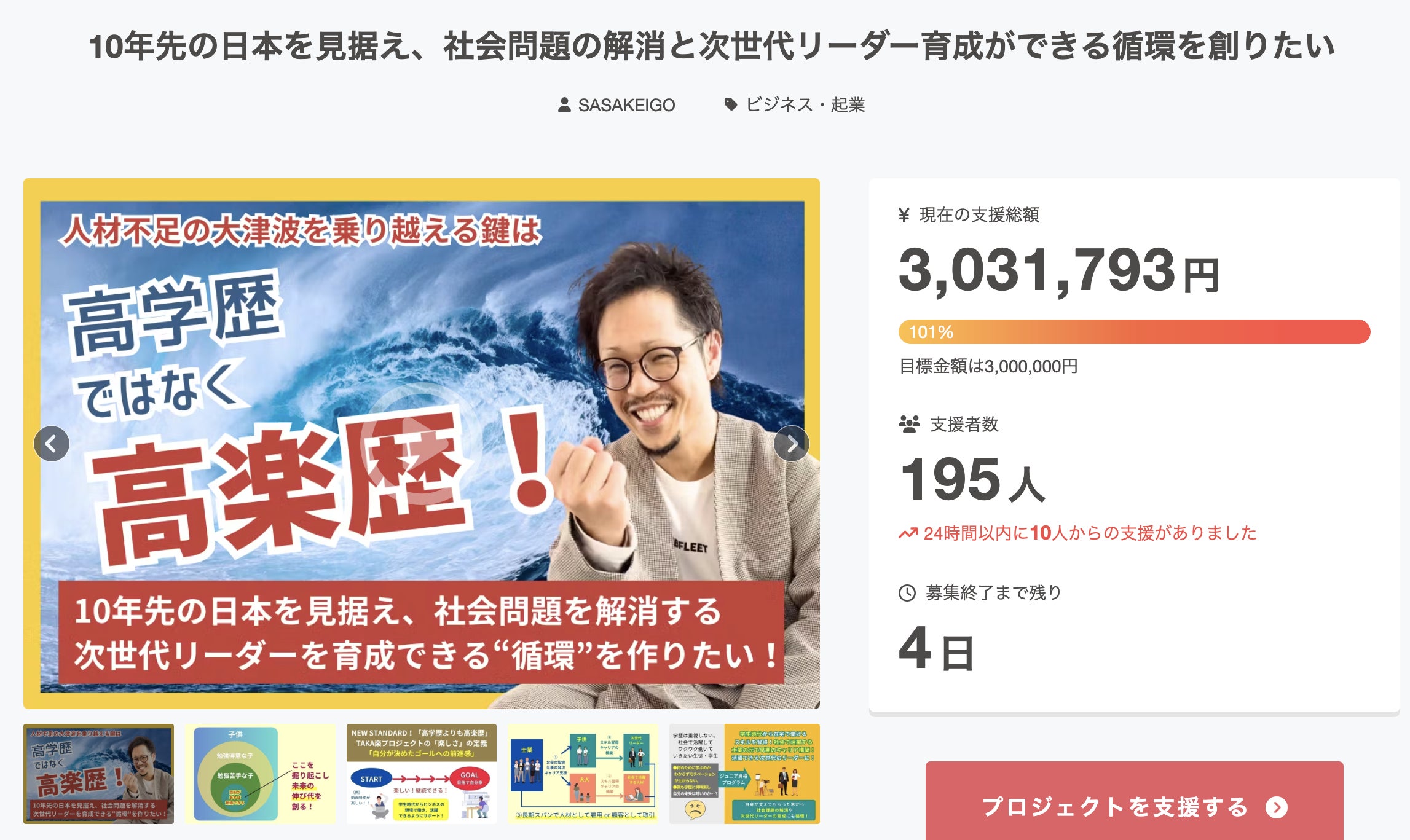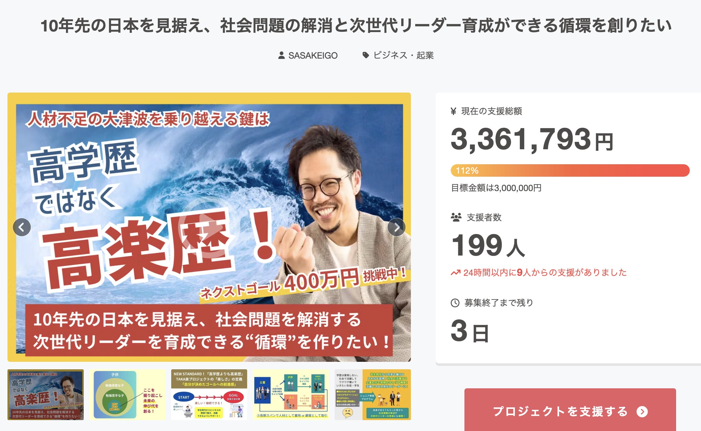 こんにちは!!笹(じてこ先生SASA)です!ネクストゴール400万達成させていただきました!『TAKA楽プロジェクト個人スポンサー(6年)』宮﨑会計・税理士事務所宮﨑雅大先生「次のゴールまでいくら必要ですか??」とご連絡いただき、熱心にプロジェクトのことを聞いていただきました。いつも、スタッフさんへの想いを熱く教えていただける先生、ほんと最高過ぎます。その経営理念は、『今』と『ちょっと先』と『未来・将来』を見据えてお客様も、スタッフ同士も安心を提供できる事務所を目指すです!TAKA楽プロジェクトも「10年先の日本を見据え、社会問題の解消と次世代リーダー育成ができる循環を創る」という想いで立ち上げているので、共感していただけたのだと実感しています。freeeやマネーフォワードなどのクラウド会計をただ「使う」だけでなく、『適切に導入・運用』までを目指して活動されていますので、クラウド会計ソフトの導入・活用などでお困りの場合は、宮﨑雅大先生にご相談ください。(HP)https://mstar-tax.jp/宮﨑先生今後とも、よろしくお願いいたします!!↓宮崎先生のInstagram↓https://www.instagram.com/masahiro38zakiそして、大伸ダイス工業(株)川島様からも『TAKA楽プロジェクト個人スポンサー(1年)』のご支援をいただきました!本当にありがとうございます!ご支援いただいた資金は、10年先も活躍する士業、大人を増やすだけでなく、次世代リーダーの育成のため、日本社会の「未来の伸び代」を作るために大切に使わせていただきます!そのための4つのプログラムを推進していくために、資金が必要です!9月30日23:59までネクストゴール「500万円」に向かっていきます!!ここまで支えてくださる皆様がいて、追い風となってくださっているおかげです。社会への「循環」を共に創っていただけると嬉しいです!最後まで届けきっていたいので、引き続きSNSシェア、ご紹介での応援をよろしくお願いします!笹圭吾(じてこ先生SASA)TAKA楽プロジェクトで実現したい世界観画像をクリックすると動画が流れます思いのたけをVoicyで配信しました!お時間ある時に聞いていただけると嬉しいです!https://voicy.jp/channel/3794/6034830TAKA楽プロジェクト協賛スポンサーの皆様【協賛個人スポンサーの皆様】・植田 麻友 様(応援メッセージ)・御堂筋税理士法人 様・あべき 光司 様・宮西 克之 様・株式会社東亜立地鑑定 様・五味田 匡功 様・山下 友一 様・森・濱田松本法律事務所 パートナー 弁護士 奥田 亮輔 様・アイユーコンサルティンググループ 岩永 悠 様、出川 裕基 様・株式会社フローリー 代表取締役 大須賀 清隆 様・税理士法人松本 松本崇宏 様・宮﨑会計・税理士事務所(宮﨑雅大税理士事務所)様・大伸ダイス工業(株)川島様貴社名や代表のお写真、ロゴなどを入れた「オリジナルのリターン」を作ってプロジェクトページ内に公開することも可能です。ぜひ、お気軽におっしゃって下さい!□挑戦中のクラウドファンディングプロジェクト10年先の日本を見据え、社会問題の解消と次世代リーダー育成ができる循環を創りたい!https://camp-fire.jp/projects/788449/view