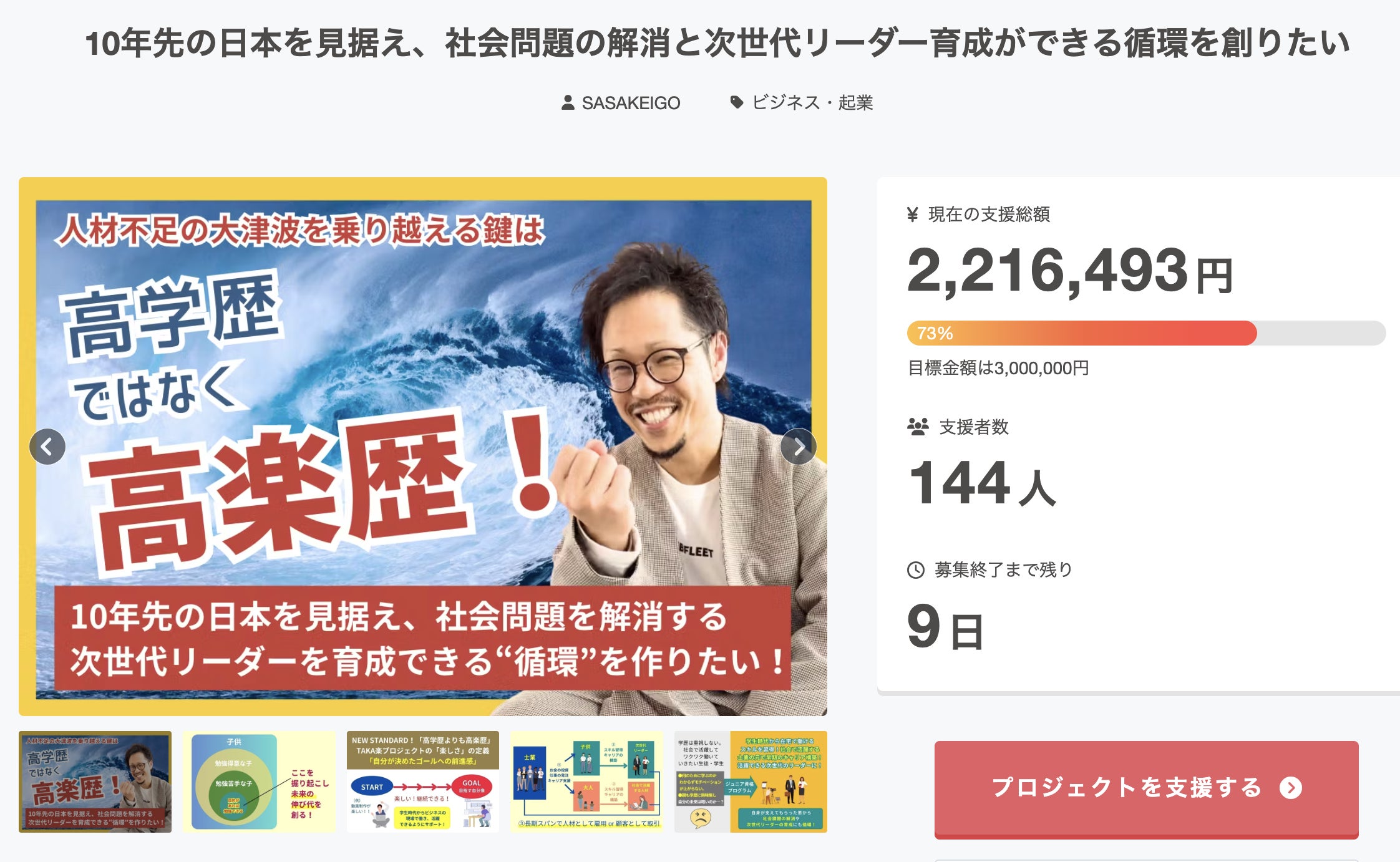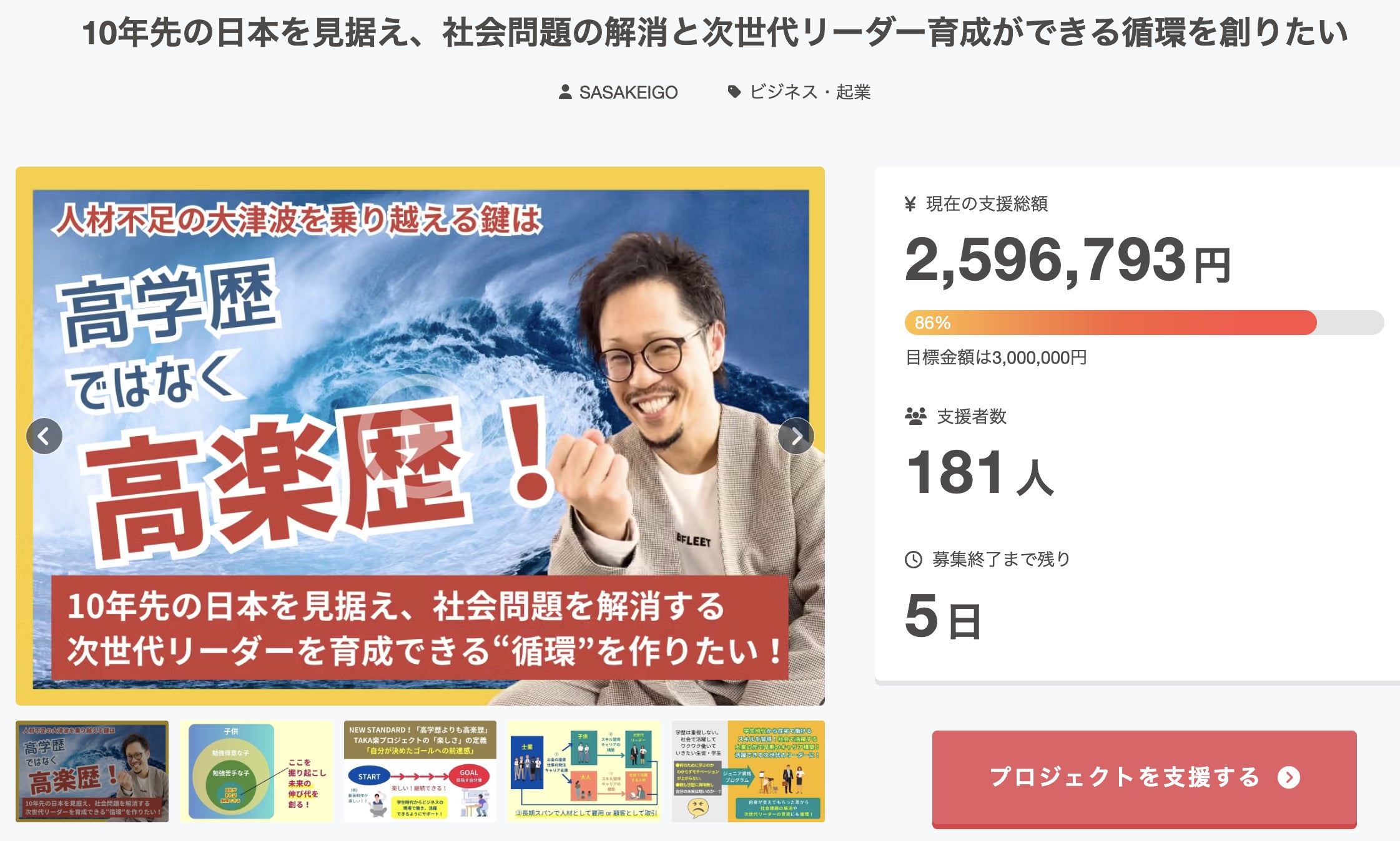 こんにちは!!笹(じてこ先生SASA)です!クラウドファンディング、現在181名のあなたからのご支援をいただいておりまして、目標達成率86%までたどり着くことができました!引き続きSNSシェア、ご紹介での応援をいただきありがとうございます!!先ほど、アイユーコンサルティンググループの岩永様、出川様から『TAKA楽プロジェクト個人スポンサー』のご支援をいただきました!アイユーコンサルティンググループは、相続・承継の問題を解決する「相続のプロ集団」です。グループビジョンは「日本のミライに豊かさを」。サポートされる中小企業・資産家を通して、日本のミライを創り、豊かにしていくために運営されています。地域経済の活性化や雇用創出にもつなげていく想いから、TAKA楽プロジェクトに共感、ご賛同いただけていると感じています!!!本当にありがとうございます!!!画像をクリックするとHPにアクセスできます!このクラウドファンディングページは、公開終了後もずっとWeb上に残り続けます。つまり、ご支援いただいたあなたとのつながりが残り続けます。これだけ多くの方々が志を共にしていただいていることに感謝です。ぼくだけでは成し遂げられない大きなプロジェクトです。でも、みんなで一緒に歩んでいただければ、未来は変えていけていると信じております!【9/27締切!】「スペシャルリターン」の募集につきまして志を共に『TAKA楽プロジェクトスポンサー』としてご参加いただくあなたのことを知っていただきたいという想いから、アイユーコンサルティング様の専用リターンのように、・会社名・代表者のお名前・ロゴ、お写真・貴社のHPアドレスが入った「スペシャルリターン」の募集をさせていただいています。クラウドファンディングあと5日間で終了することもあり、「スペシャルリターン」の追加は、9月27日の15時までにCAMPFIREに申請する必要があります。(土日はCAMPFIREがお休みのため)間に合えば、ギリギリ最終日の9月30日にリターン追加ができるようになります。「10年先の日本を見据え、社会問題の解消と次世代リーダー育成ができる循環」を創るという目的にご賛同、共感いただけましたら、ぜひご連絡ください!よろしくお願いします!!笹圭吾(じてこ先生SASA)TAKA楽プロジェクトで実現したい世界観画像をクリックすると動画が流れます思いのたけをVoicyで配信しました!お時間ある時に聞いていただけると嬉しいです!https://voicy.jp/channel/3794/6034830TAKA楽プロジェクト協賛スポンサーの皆様【協賛個人スポンサーの皆様】・植田 麻友 様(応援メッセージ)・御堂筋税理士法人 様・あべき 光司 様・宮西 克之 様・株式会社東亜立地鑑定 様・五味田 匡功 様・山下 友一 様・森・濱田松本法律事務所 パートナー 弁護士 奥田 亮輔 様・アイユーコンサルティンググループ 岩永 悠 様、出川 裕基 様貴社名や代表のお写真、ロゴなどを入れた「オリジナルのリターン」を作ってプロジェクトページ内に公開することも可能です。ぜひ、お気軽におっしゃって下さい!□挑戦中のクラウドファンディングプロジェクト10年先の日本を見据え、社会問題の解消と次世代リーダー育成ができる循環を創りたい!https://camp-fire.jp/projects/788449/view