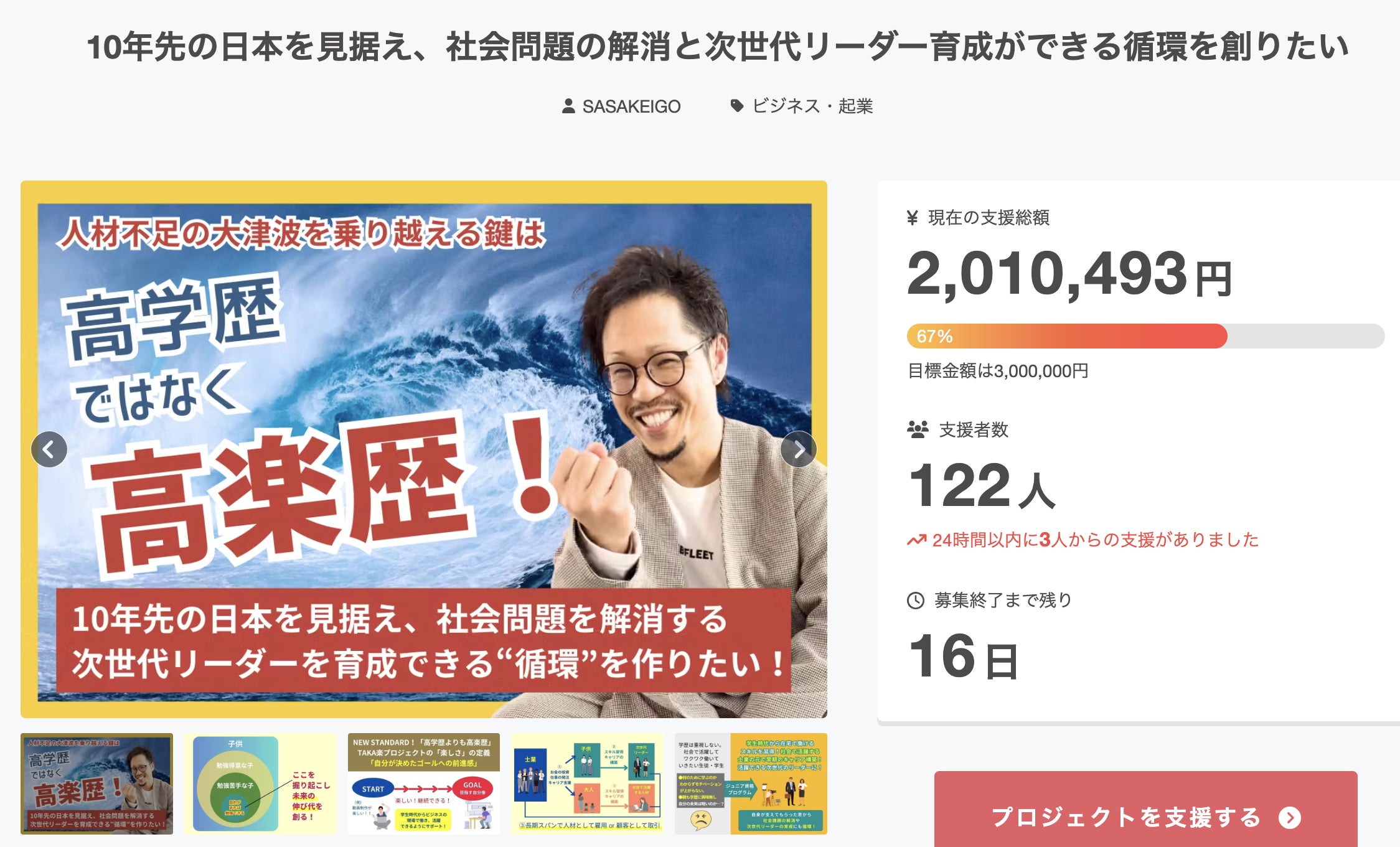 こんにちは!!笹(じてこ先生SASA)です!現在、125名のあなたのご支援を受け、クラウドファンディングは目標達成率は68%となっています!!SNSシェア、応援、たくさんいただき本当にありがとうございます!未来を創る循環!大人の挑戦が子供たちを育む!ぼくたちは今、日本の将来を左右する重大な岐路に立っています。深刻化する人材不足は、あらゆる業界に影響を及ぼし、その波はこれからさらに大きくなることが国の調査・分析でもわかっています。しかし、この危機を乗り越える鍵は私たちの手の中にあります。それが「教育」です。高学歴より高楽歴!「新しい教育の形」これまでの受験勉強に軸足を置く考え方から脱却し、「高楽歴」という新しい概念を中心に据えた教育システムの構築を実現したいのです。これは、知識を蓄積させることや受験を突破するためのものではなく、社会人になってからも生涯学ぶことの楽しさを感じたり、挑戦する喜び、そして成長の実感を重視する教育です。大人の挑戦が子供たちを導くこのプロジェクトの核心は、「今の大人たちが挑戦する姿を子供たちに見せていくこと」にあります。ぼくたち大人が新しいことに挑戦し、失敗を恐れず前進する姿は、子供たちにとって最も力強い影響を与えるとともに、それ自体も教育となります。「大人たちがワクワク生きている!」「大人になって働くことって楽しいことなんだ!」そういった想いを子供たちにつくってもらうには、アドバイスをしたり、言うだけでは足りません。ワクワク生き、働いている大人の姿を見ること無しには感じ難しいのです。でも、それこそが次世代のリーダーを育成する土壌となると信じています!未来を創る循環を創り出すぼくたちが目指すのは、一時的な解決策ではありません。社会問題の解消と次世代リーダーの育成が互いに影響し合い、持続可能な発展を生み出す「循環」の創出です。この循環は、10年先、さらにその先の日本社会を支える強固な基盤となります。すでに120名以上の方々からご支援をいただいていますが、この取り組みをさらに大きく、強固なものにするために、皆様のお力添えが必要です。経済状況に左右されず、誰もがワクワクしながら働ける環境づくりは、今を生きるぼくたち一人一人の行動から始まります。あなたの支援は、日本の未来を変える力です!!あなたの参加が必要ですこのプロジェクトに参加していただくことで、・次世代のリーダー育成に貢献できます・新しい教育システムの構築に関わることができます・社会問題の解決に向けた具体的な一歩を踏み出せます共に、ワクワク明るい未来を創り出していきませんか?一緒に、未来を担う子供たちに、希望に満ちた社会を届けましょう!TAKA楽プロジェクト協賛スポンサーの皆様【協賛個人スポンサーの皆様】・植田 麻友様・御堂筋税理士法人様・あべき 光司様・宮西 克之様・株式会社東亜立地鑑定様・五味田 匡功様貴社名や代表のお写真、ロゴなどを入れた「オリジナルのリターン」を作ってプロジェクトページ内に公開することも可能です。ぜひ、お気軽におっしゃって下さい!一緒にプロジェクトを盛り上げていけると嬉しいです!よろしくお願いします!笹圭吾(じてこ先生SASA)思いのたけをVoicyで配信しました!お時間ある時に聞いていただけると嬉しいです!https://voicy.jp/channel/3794/6034830□挑戦中のクラウドファンディングプロジェクト10年先の日本を見据え、社会問題の解消と次世代リーダー育成ができる循環を創りたい!https://camp-fire.jp/projects/788449/view