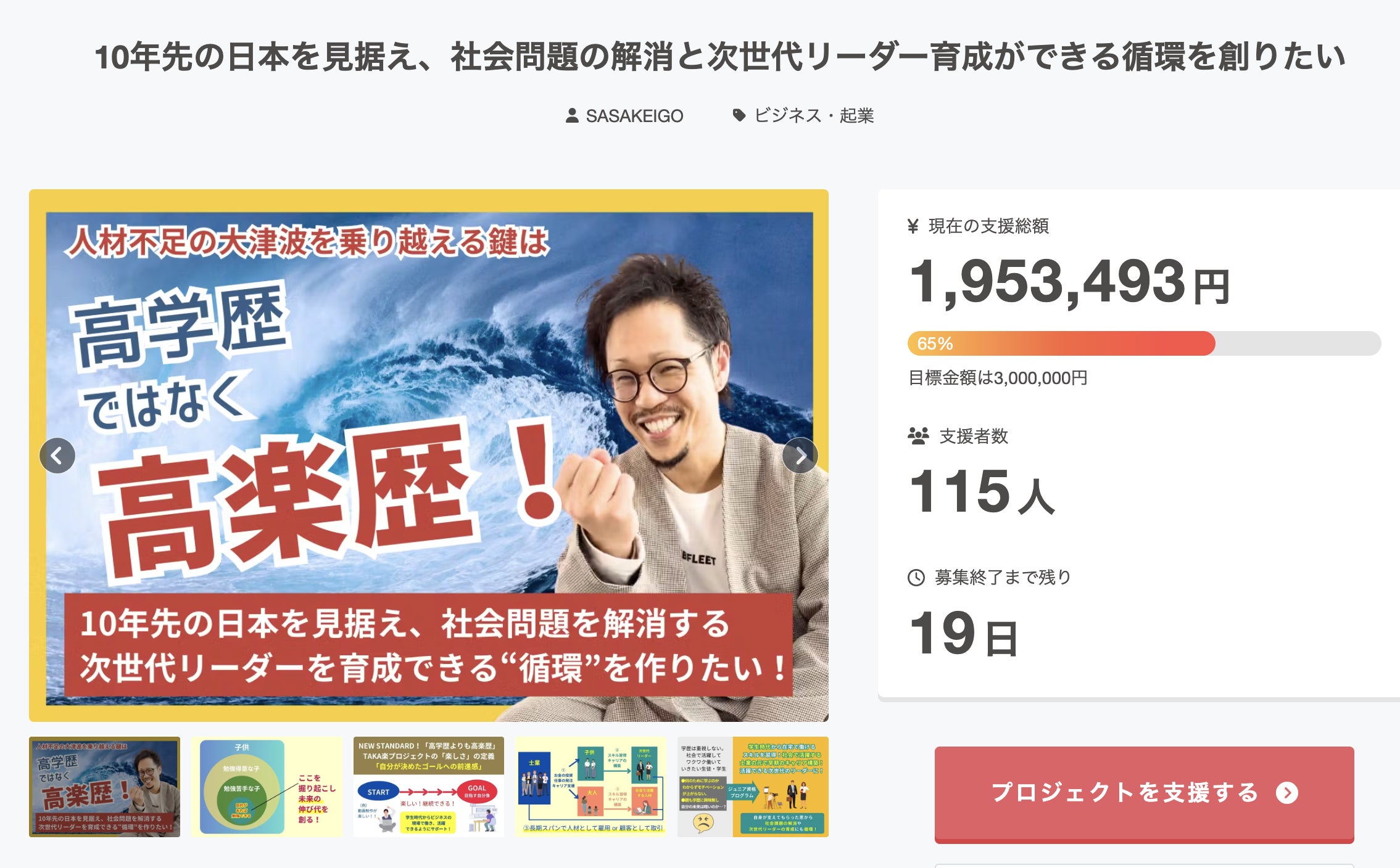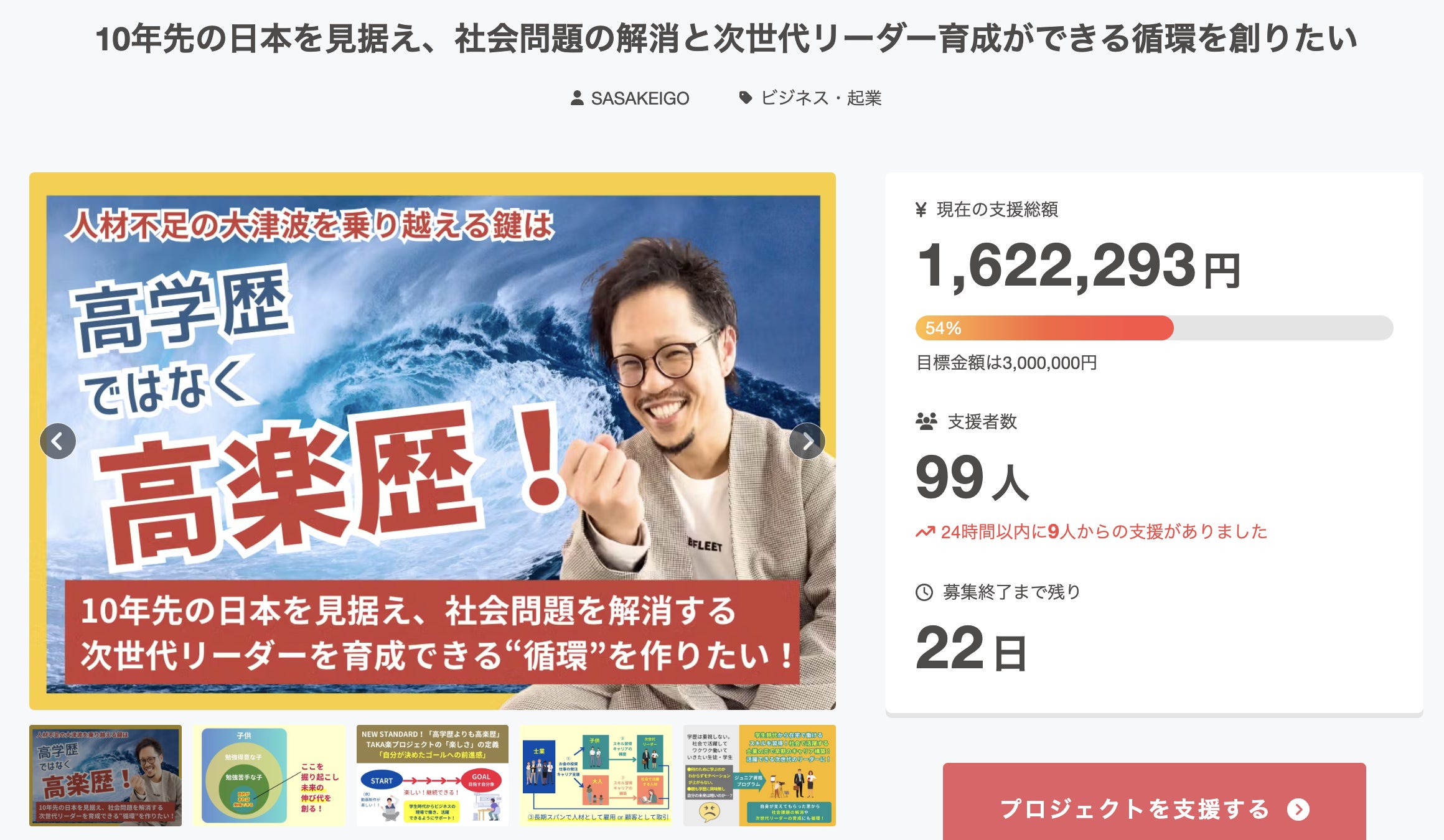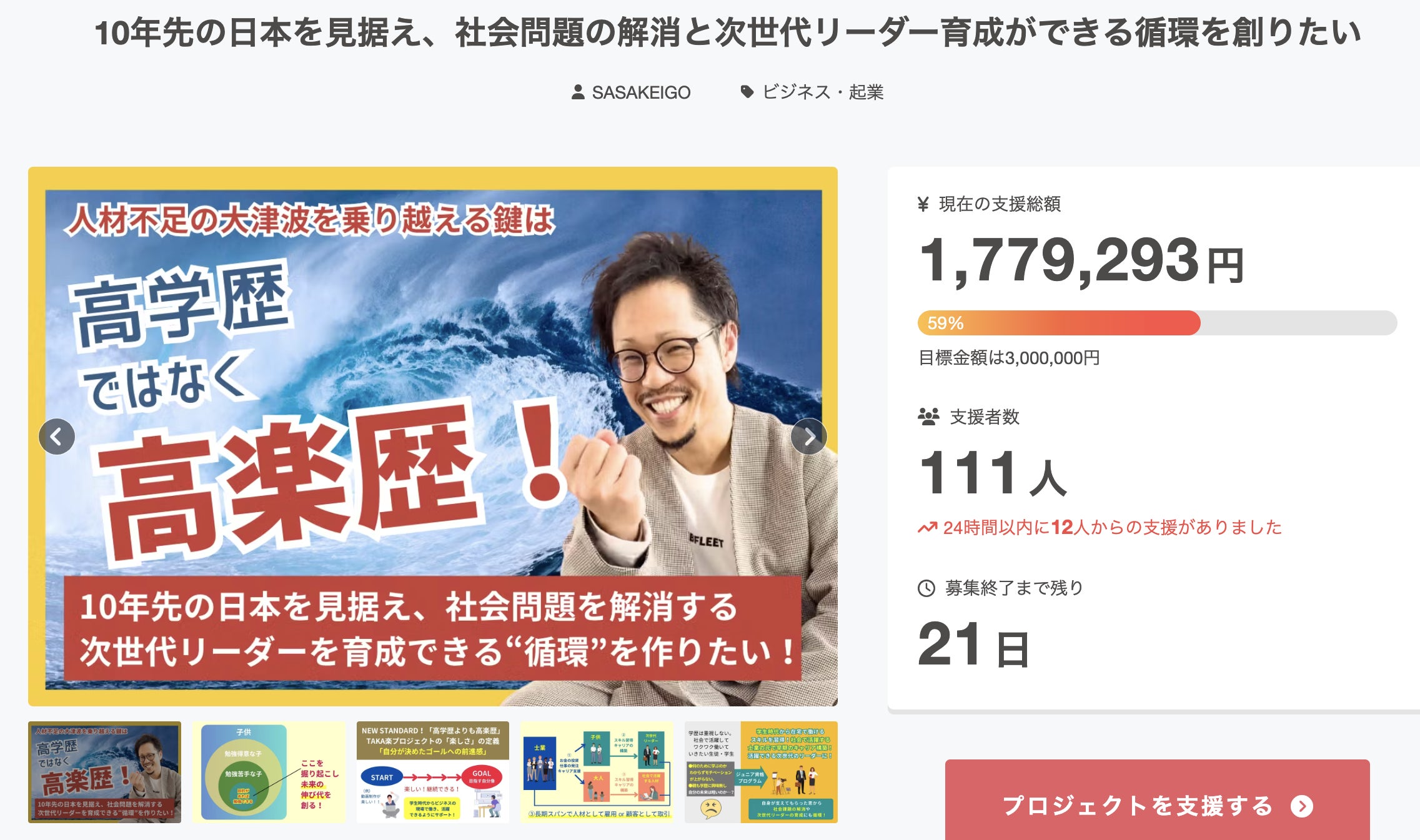 こんにちは!!笹(じてこ先生SASA)です!現在、クラウドファンディングは目標達成率は65%に!115名のあなたのご支援いただいております!ありがとうございます!「10年先の日本を見据え、社会問題の解消と次世代リーダー育成ができる循環」創るためのプロジェクトへの応援、ご協力を引き続き、よろしくお願いします!『らく税』めちゃくちゃ盛り上がってます!こちら、動画編集未経験の『らく税』メンバーが作った動画です!!動画のリンク先です!この度、これまで運営していた「士業近未来コミュニケーション大学」は「士業大楽」に生まれ変わります。そのコミュニティ大学の勝部先生とらく税メンバーのコラボで制作した動画がこちらです!!このクオリティでモニター価格月額1万円で請負可能です。残り5社になりますので、ショート動画に興味のある士業の方はぜひお問合せください。「士業大楽」は、士業が独立したら学んでおきたいビジネス思考、マーケティングノウハウ、SNS、営業、顧客コミュニケーション、組織マネジメントなどが総合的に学べる教育機関に生まれ変わります。価格改定を予定していますので、ぜひ今のうちに仲間になっておいて下さい。ちなみに、動画編集サポートも当会員向けのサービスになります。『士業大楽』の会員権利はクラファンで入会金無料でお試しいただけますので、ぜひよろしくお願いいたします。『らく税』会員もクラウドファンディングのリターンで申し込みいただくとめちゃくちゃお得です!通常12,920円のところ5,000円(今なら2ヶ月じゃなく9月〜12月の4ヶ月で5,000円)で体験していただけるようにしています!一緒にやっていきましょう!よろしくお願いします!TAKA楽プロジェクトへの想いと協賛個人スポンサーの皆様お一人お一人からご支援、応援をいただいていることにより、僕の構想がどんどん現実化していってます。日本の文化を変えるようなプロジェクトです!!僕が子供頃、早く大人になりたかった!!田舎の商店街の中にあった実家は常に活気があり、大人が楽しそうだった!!我が子にどんな未来を託すか?進化した結果の課題感をどの時代も乗り越え、より豊かにしてきた先人たちの意志を継ぐプロジェクトです。ぜひ、応援よろしくお願いいたします!!この『TAKA楽プロジェクト』は大きく分けて、・10年先も活躍し続ける士業を増やす・10年先も活躍し続ける大人を増やす・社会問題解決、次世代リーダー育成に取り組む士業にスポットを当てる・10年先に活躍し続けられる次世代リーダーを増やすこれら4つの大きなビジネスの複合体です。こんなものは僕一人では、どうすることもできないんです。行く道が同じ方向の方いたら一緒に行きませんか?あなたの力が必要です!【協賛個人スポンサーの皆様】・植田 麻友様・御堂筋税理士法人様・あべき 光司様・宮西 克之様・株式会社東亜立地鑑定様・五味田 匡功様貴社名や代表のお写真、ロゴなどを入れた「オリジナルのリターン」を作ってプロジェクトページ内に公開することも可能です。ぜひ、お気軽におっしゃって下さい!TAKA楽プロジェクトで実現したい世界観一緒にプロジェクトを盛り上げていけると嬉しいです!よろしくお願いします!笹圭吾(じてこ先生SASA)思いのたけをVoicyで配信しました!お時間ある時に聞いていただけると嬉しいです!https://voicy.jp/channel/3794/6034830□挑戦中のクラウドファンディングプロジェクト10年先の日本を見据え、社会問題の解消と次世代リーダー育成ができる循環を創りたい!https://camp-fire.jp/projects/788449/view