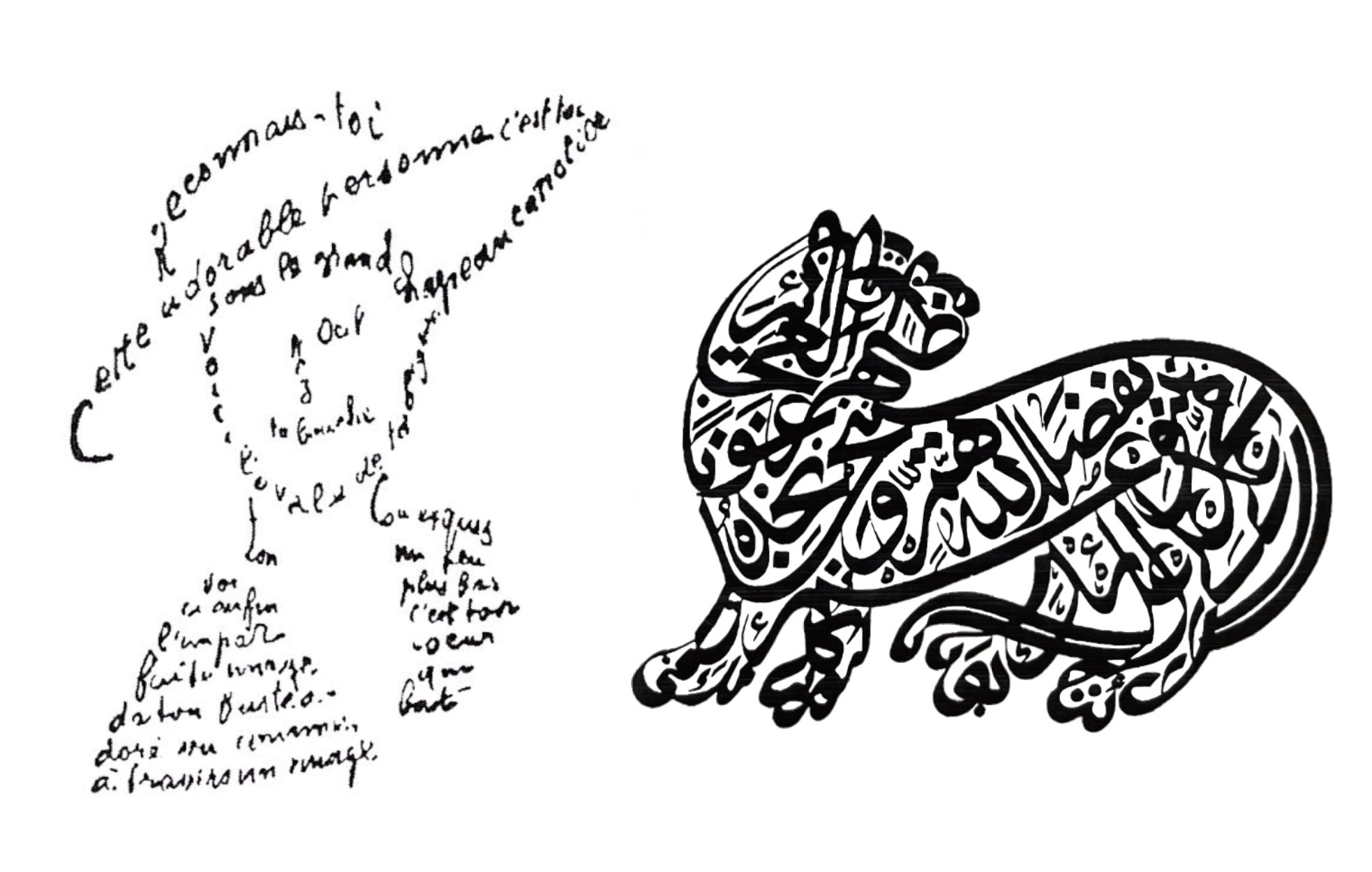 文字と絵を組み合わせた表現(左:カリグラム 右:カリグラフィックドローイング)