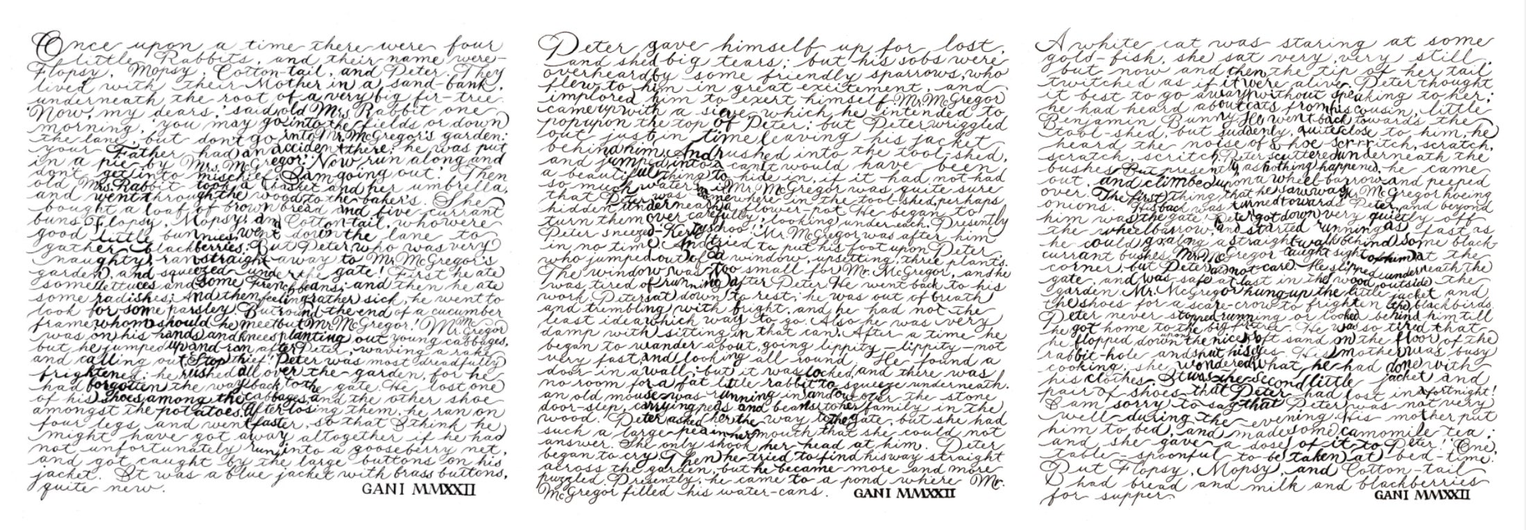 ピーターラビットのおはなし』の全文を3分割して手書きしながらその場面の挿絵を同時に表現した、3枚組の文画作品