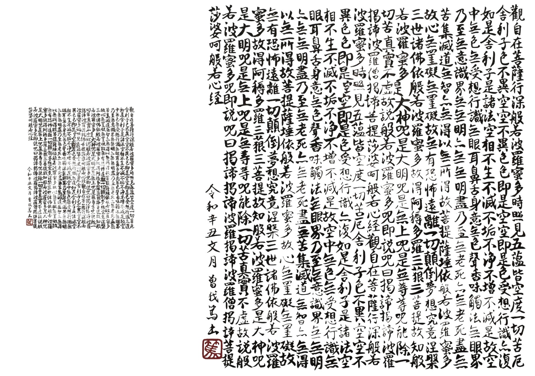 第49回 國際書道連盟展 秀作受賞「芳一」(般若心経の中から、座禅を組んだ人物が浮かび上がってきます)